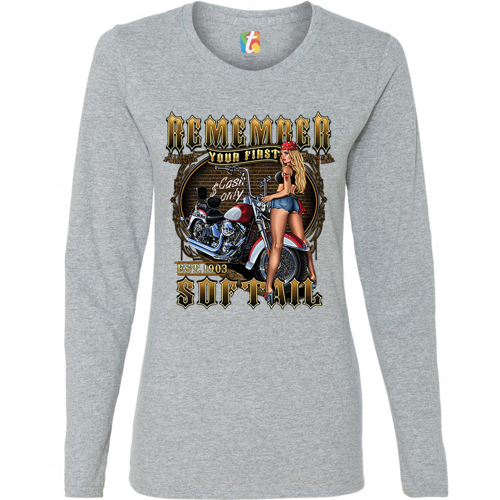 A print featuring a sexy pin-up girl in daisy dukes standing in front of a motorcycle. In the background there is a brick wall with "$ cash only" written on it. The print says: "Remember your first softail, biker forever, biker til i die, est. 1903". A gr