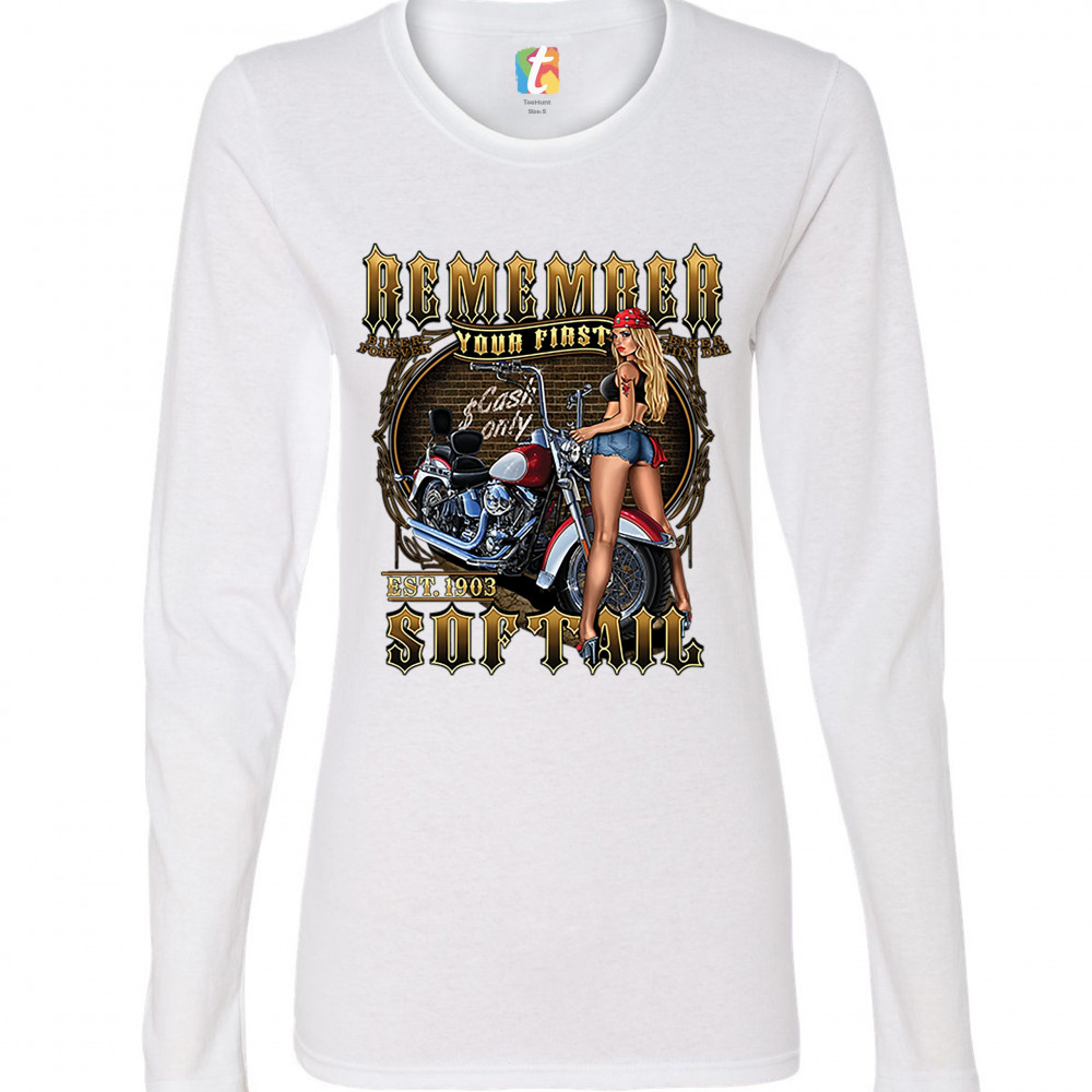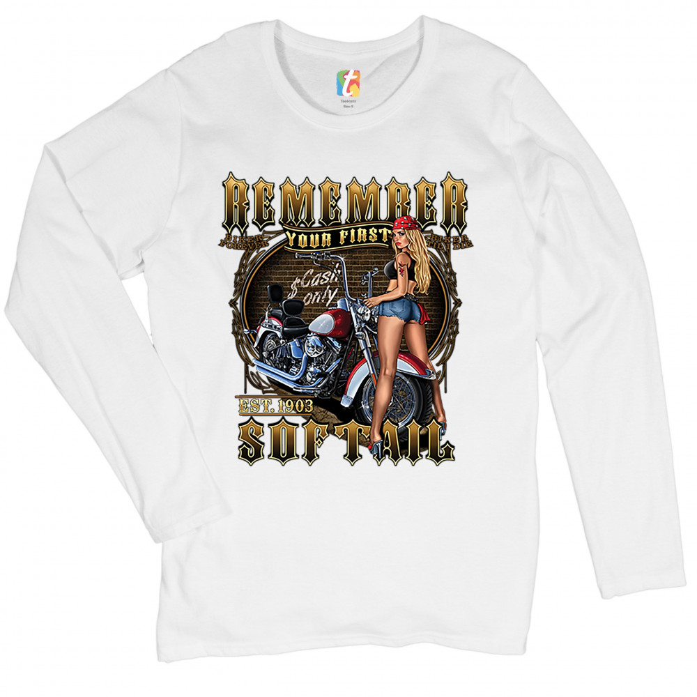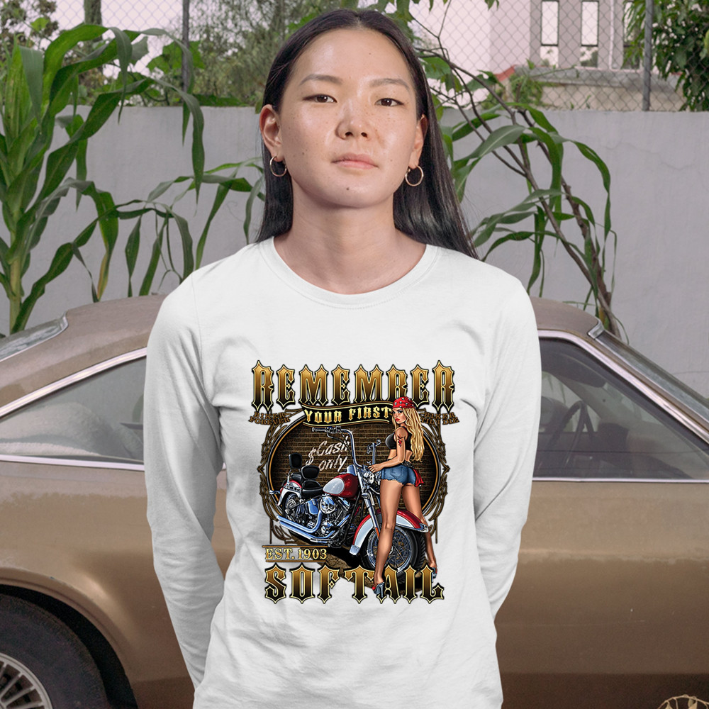 A print featuring a sexy pin-up girl in daisy dukes standing in front of a motorcycle. In the background there is a brick wall with "$ cash only" written on it. The print says: "Remember your first softail, biker forever, biker til i die, est. 1903". A gr