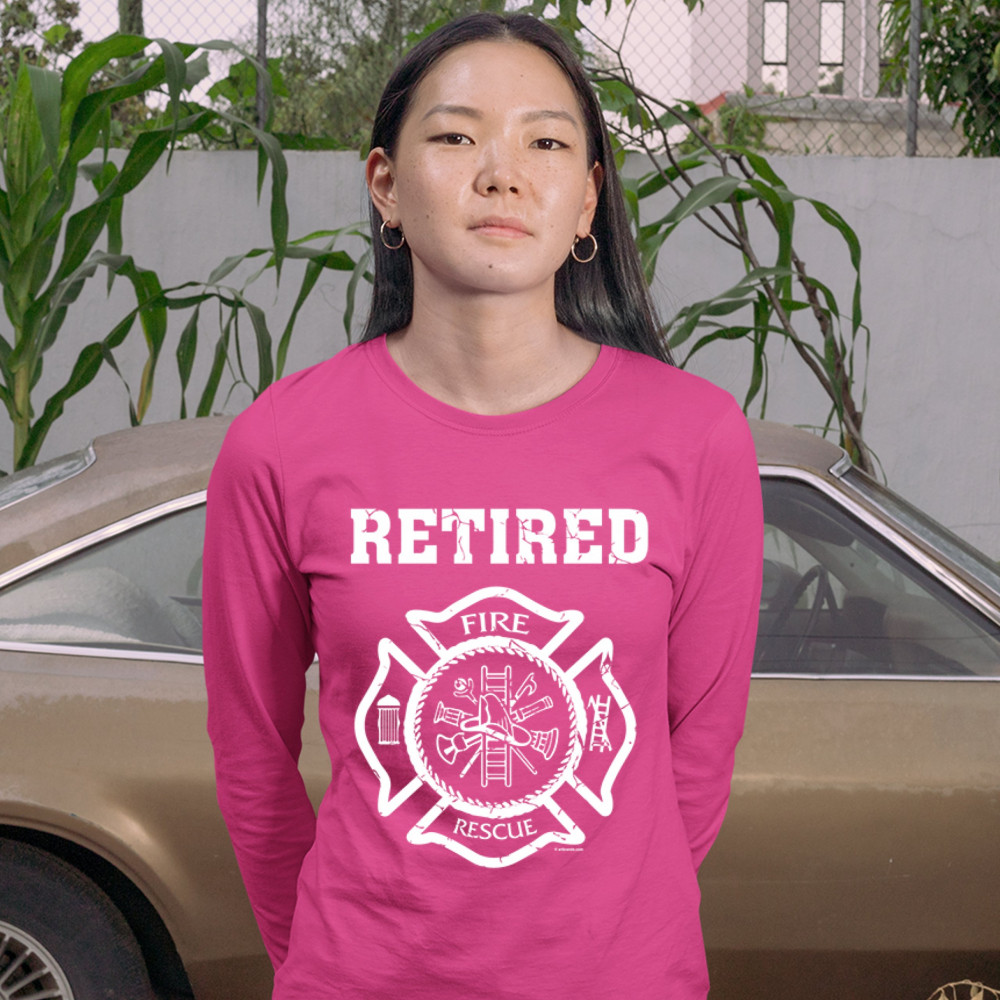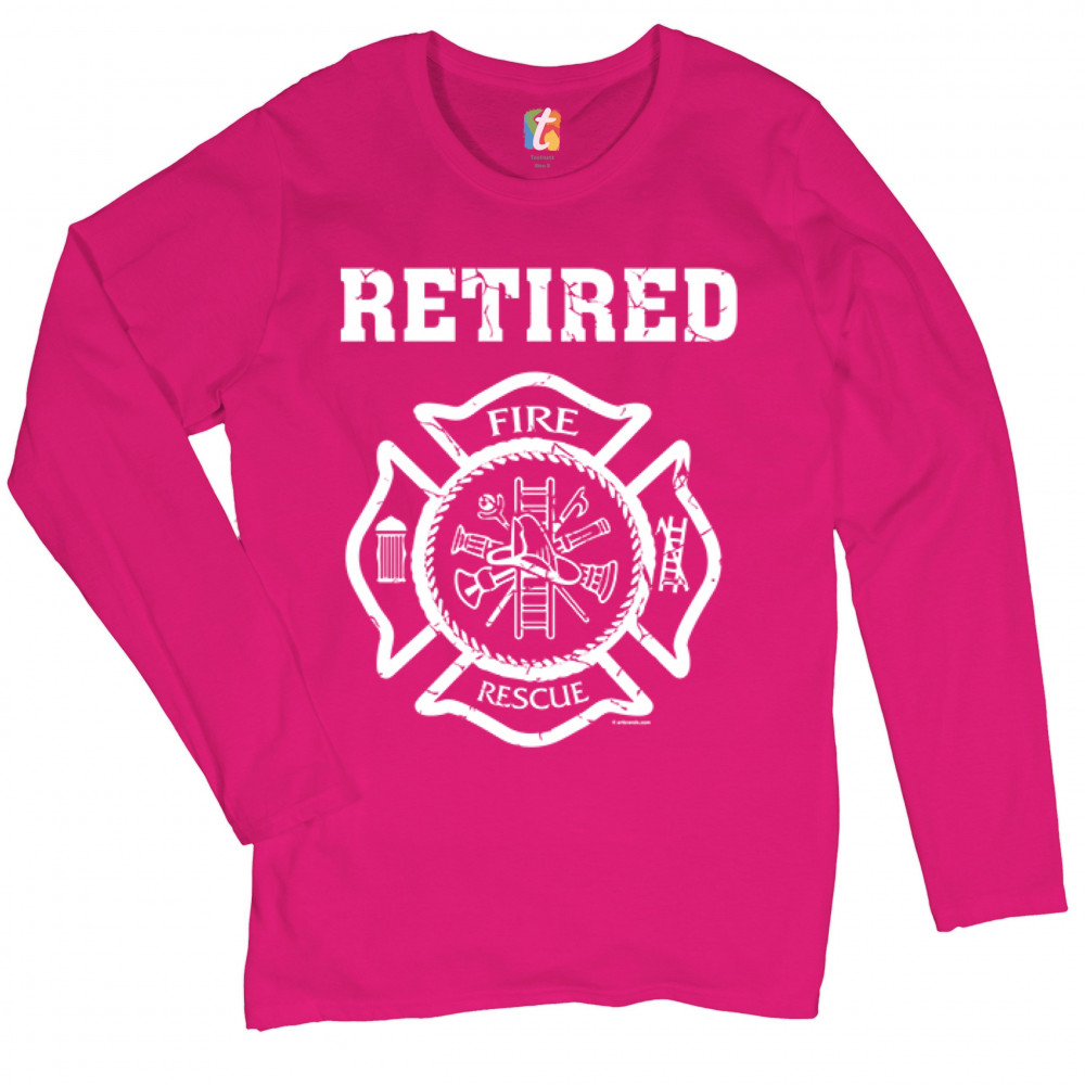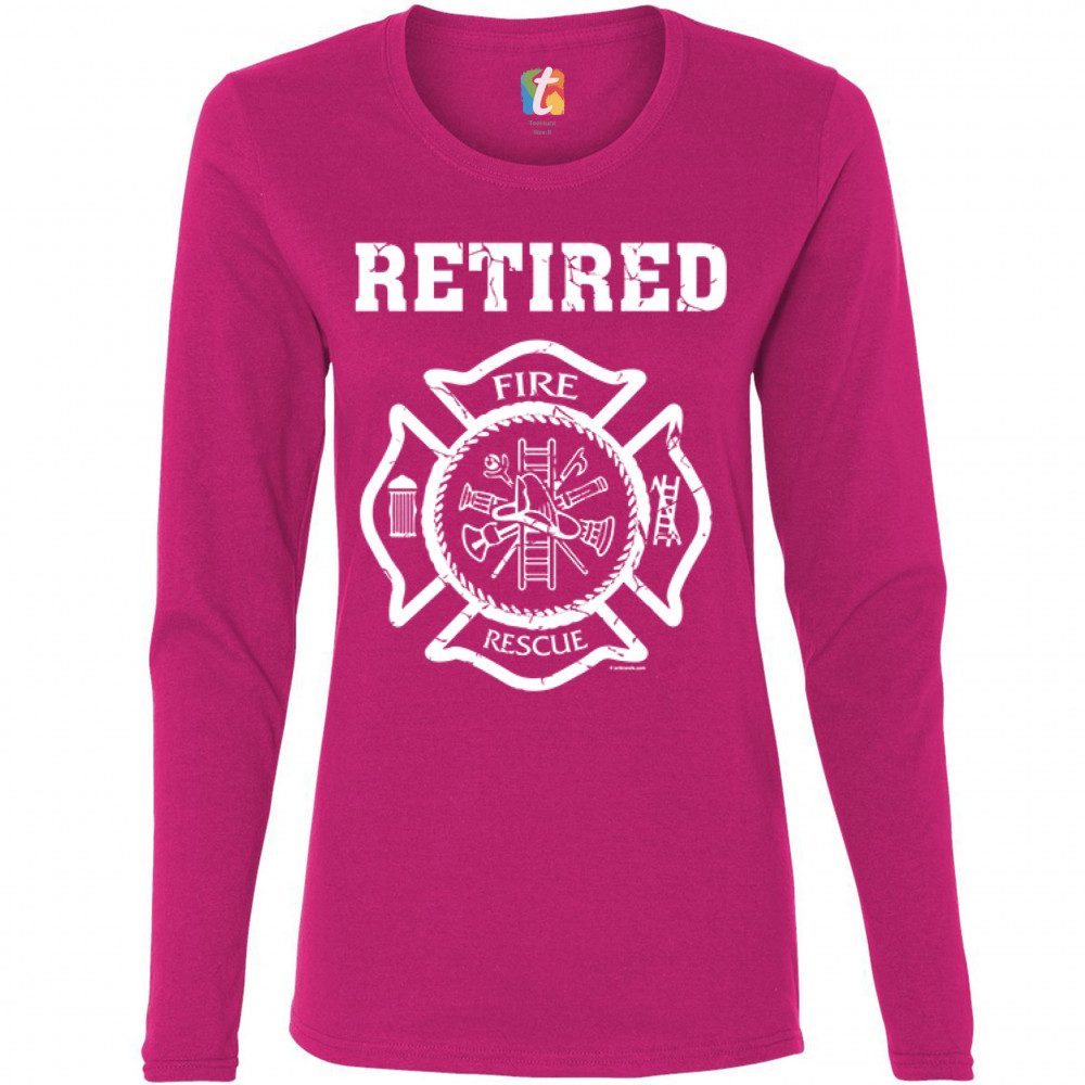 RETIRED FIREFIGHTER BADGE women's long sleeve t-shirt fire and rescue fire dept pink