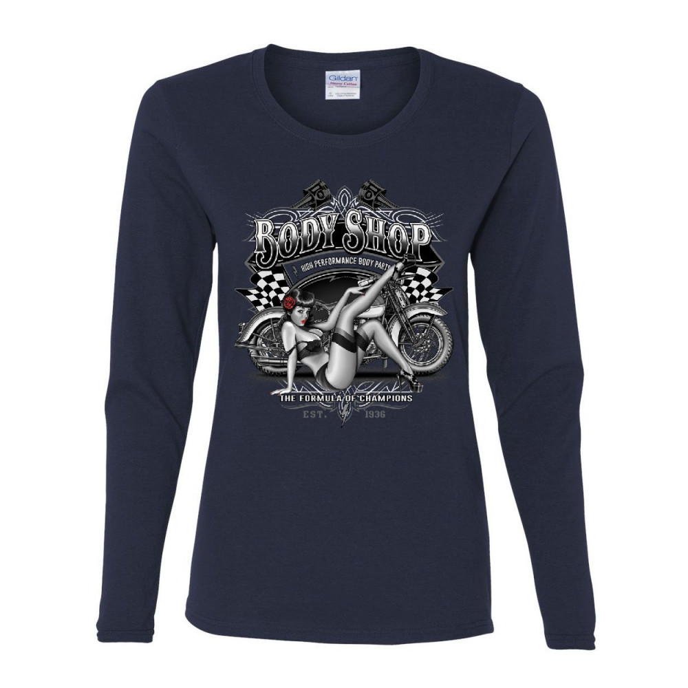 RETRO BODY SHOP women's long sleeve tee chopper sexy pin-up girl route 66 biker navy blue
