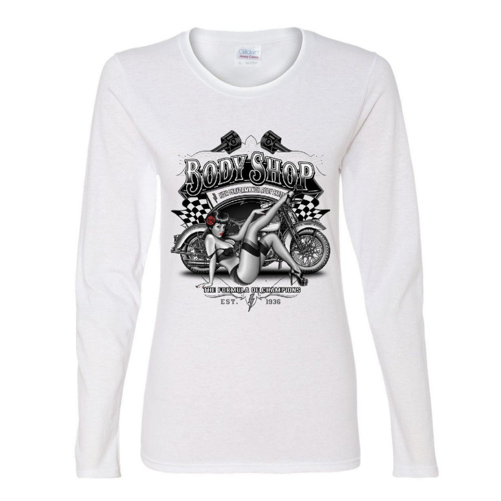 RETRO BODY SHOP women's long sleeve tee chopper sexy pin-up girl route 66 biker white