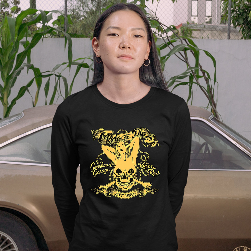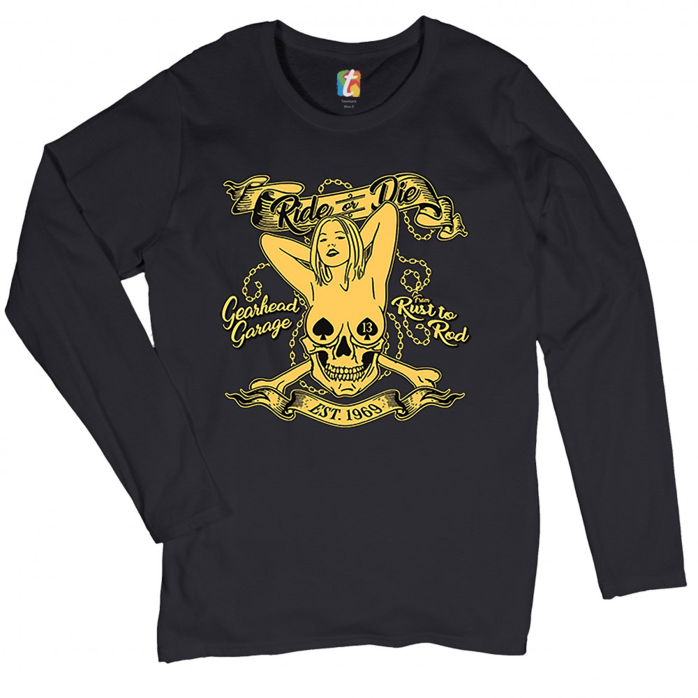 A print featuring a naked woman with her hands behind her head and spades as nipple covers. Her body is mixed with a skull. There are crossed bones and multiple chains in the background. The print says: "Ride or Die, Gearhead Garage, Rust to Rod, Est. 196