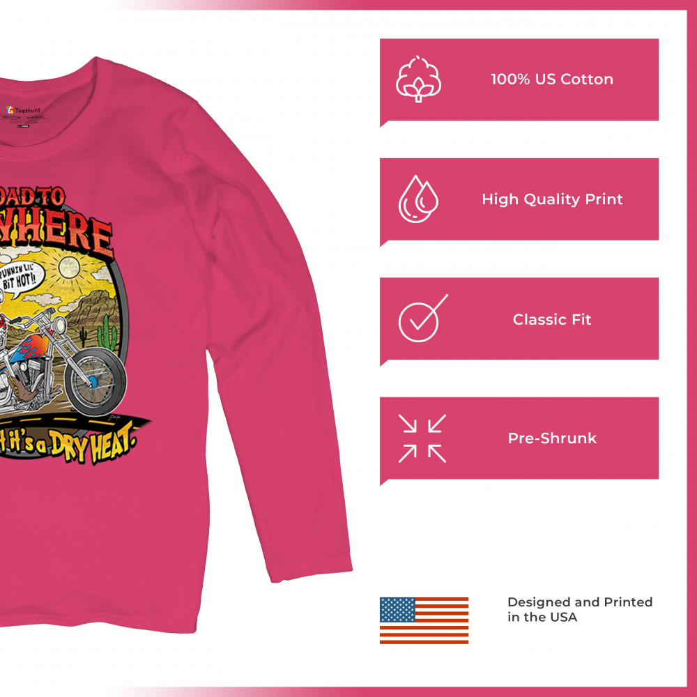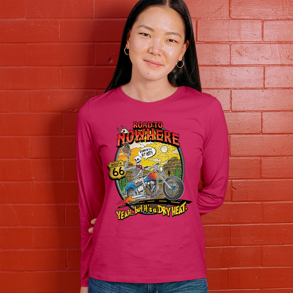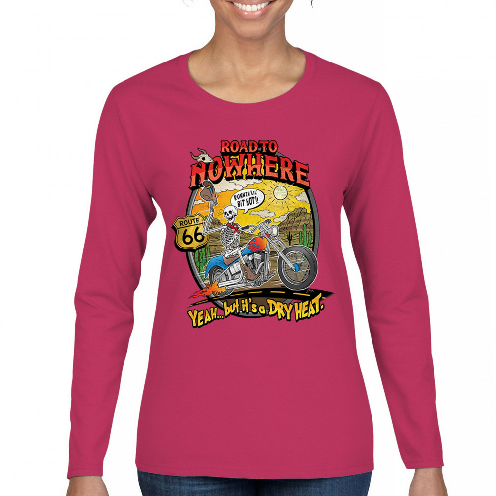 Discover the 'Road to Nowhere' T-shirt: a blend of bold graphics and adventurous spirit. Embrace the ride with our Route 66 skeleton biker design.