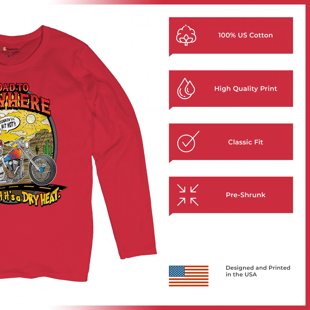 Our 'Road to Nowhere' tee is a salute to the thrill-seekers and the heat-bravers. Adorned with a bold skeleton cruising down Route 66, it embodies the spirit of adventure with a touch of playful defiance. A statement piece for anyone who lives for the ride and laughs in the face of danger. Join the ride into the sunset with this daring design.