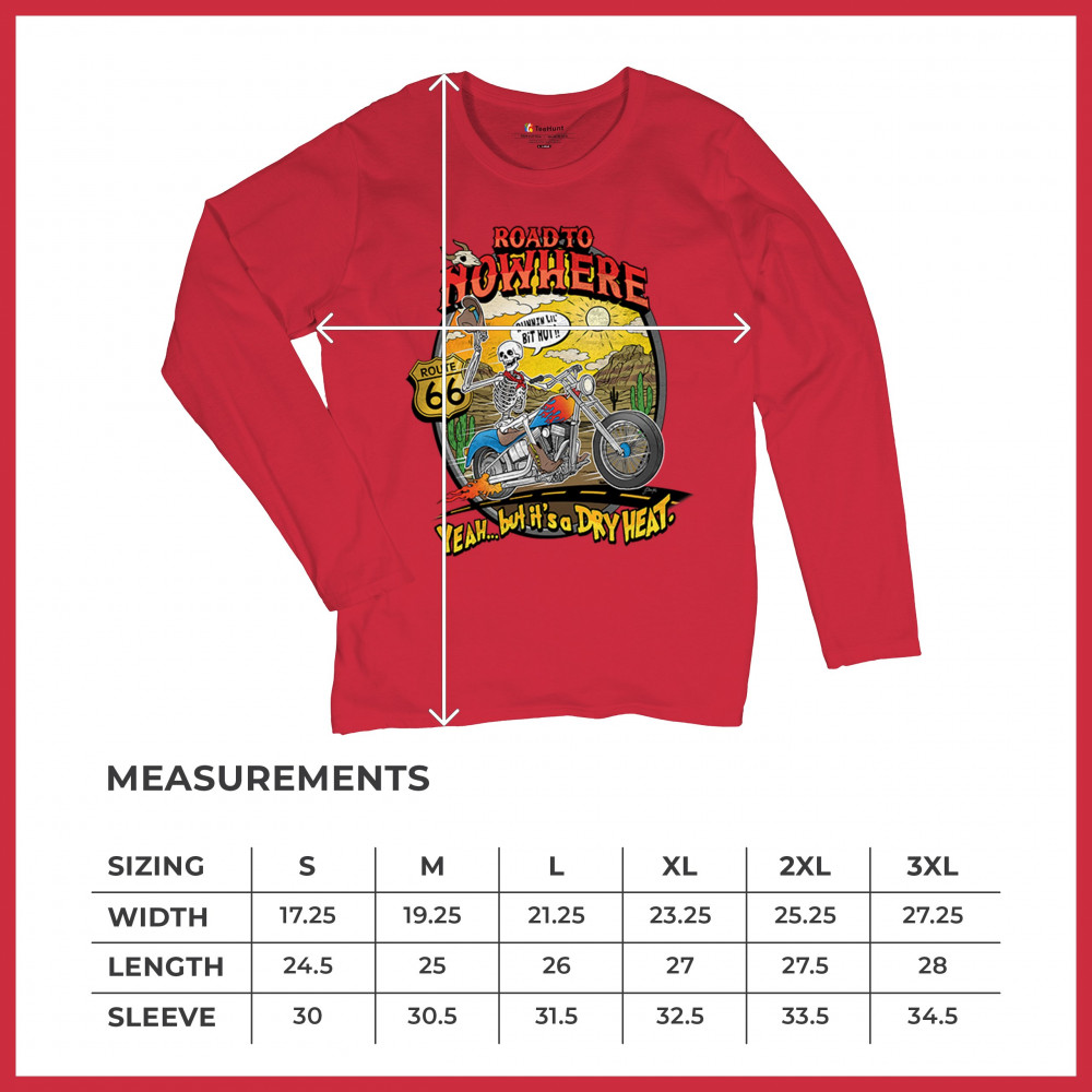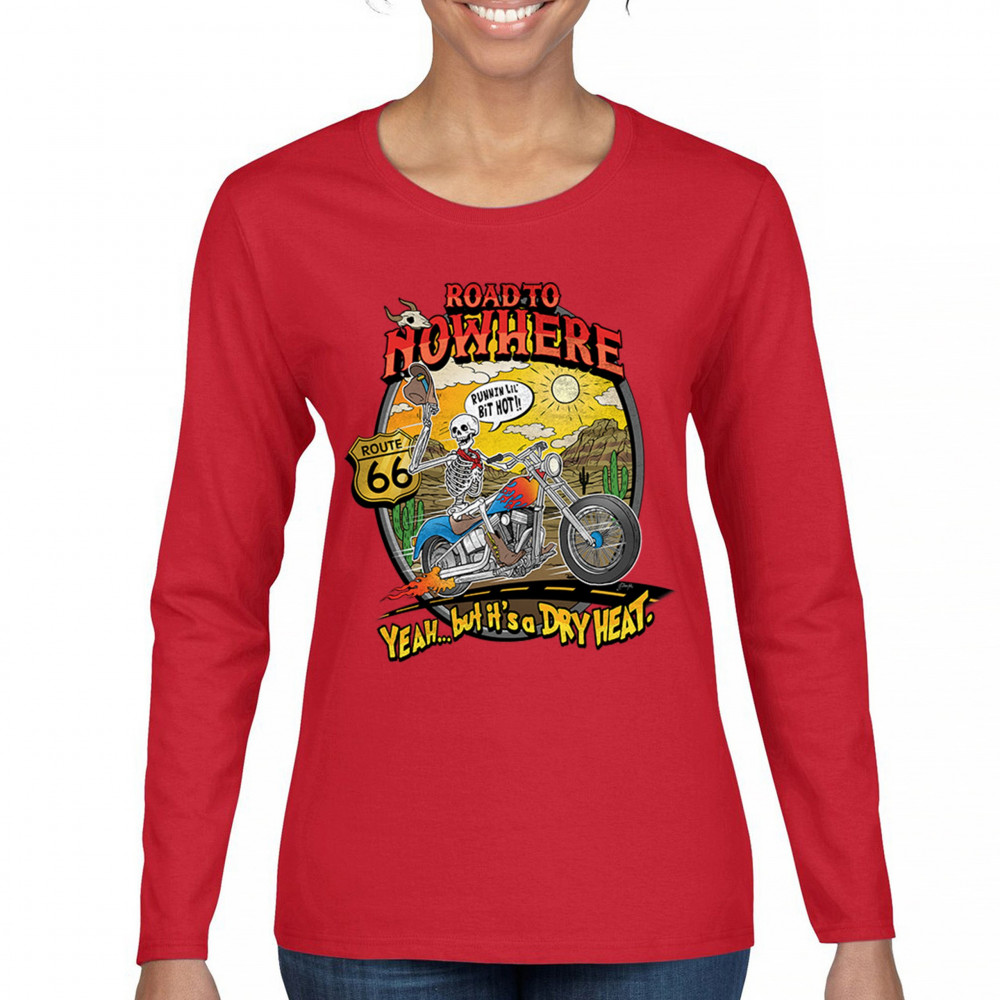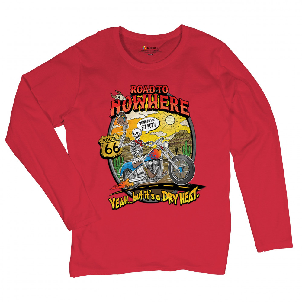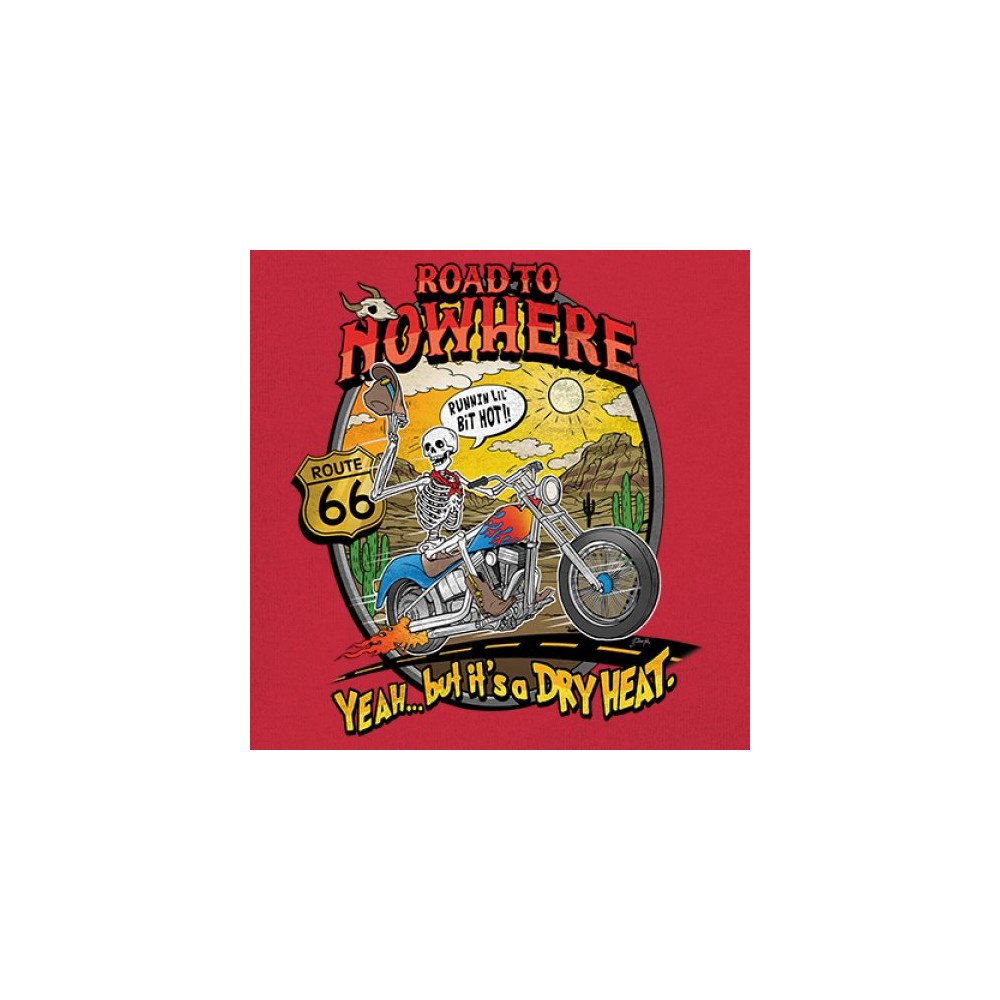 Discover the 'Road to Nowhere' T-shirt: a blend of bold graphics and adventurous spirit. Embrace the ride with our Route 66 skeleton biker design.