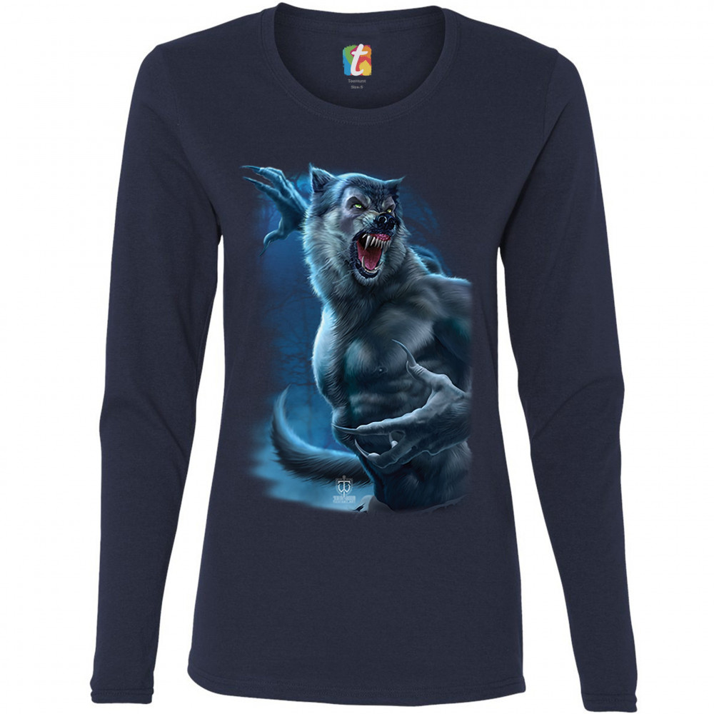 ROARING WEREWOLF women's long sleeve t-shirt halloween scary gothic monster navy blue