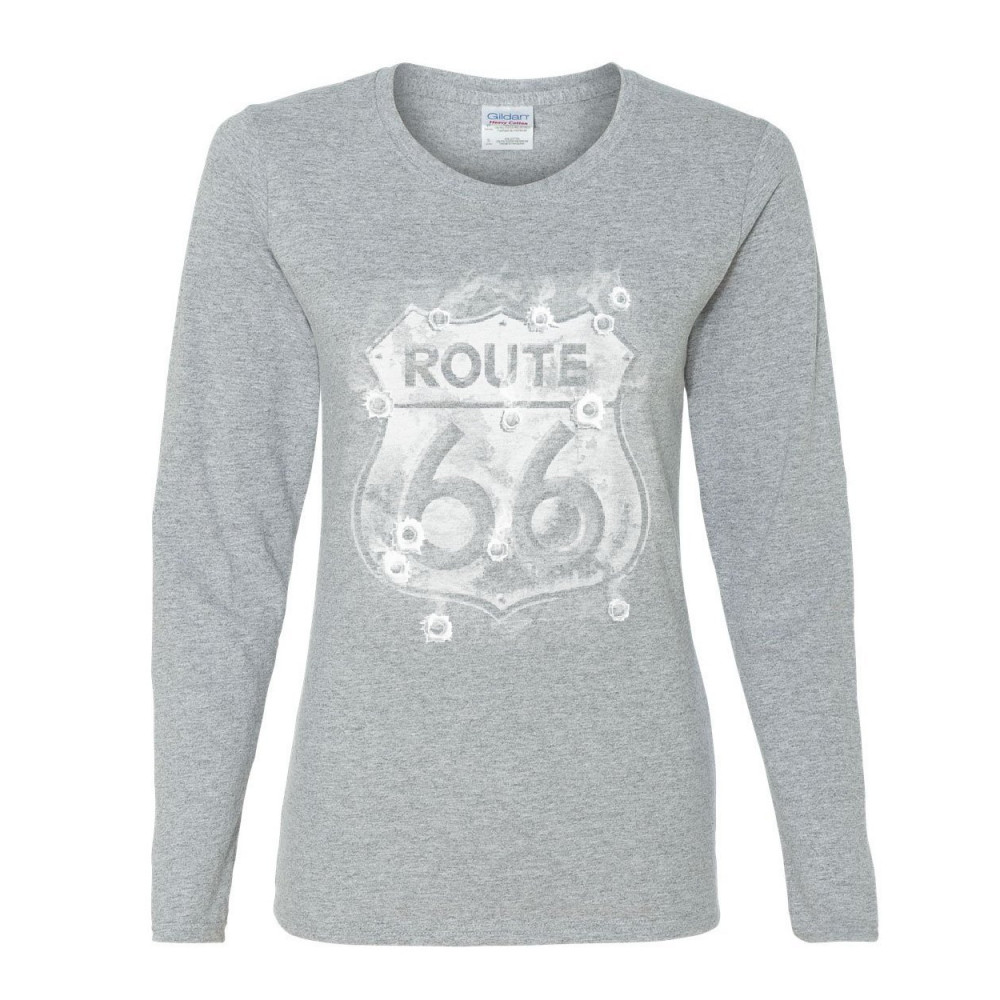 ROUTE 66 SIGN WITH BULLET HOLES route 66 women's long sleeve tee bullet holes the mother road american highway gray