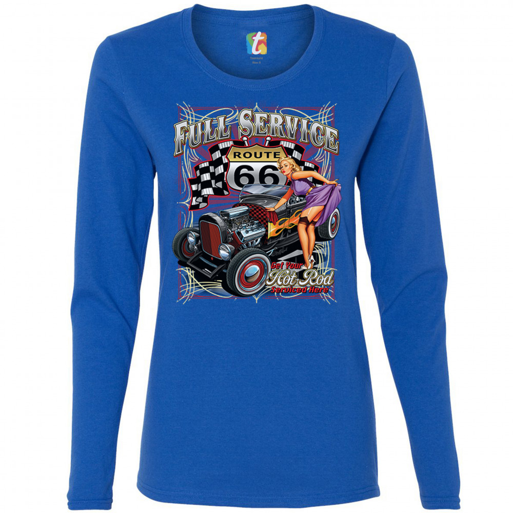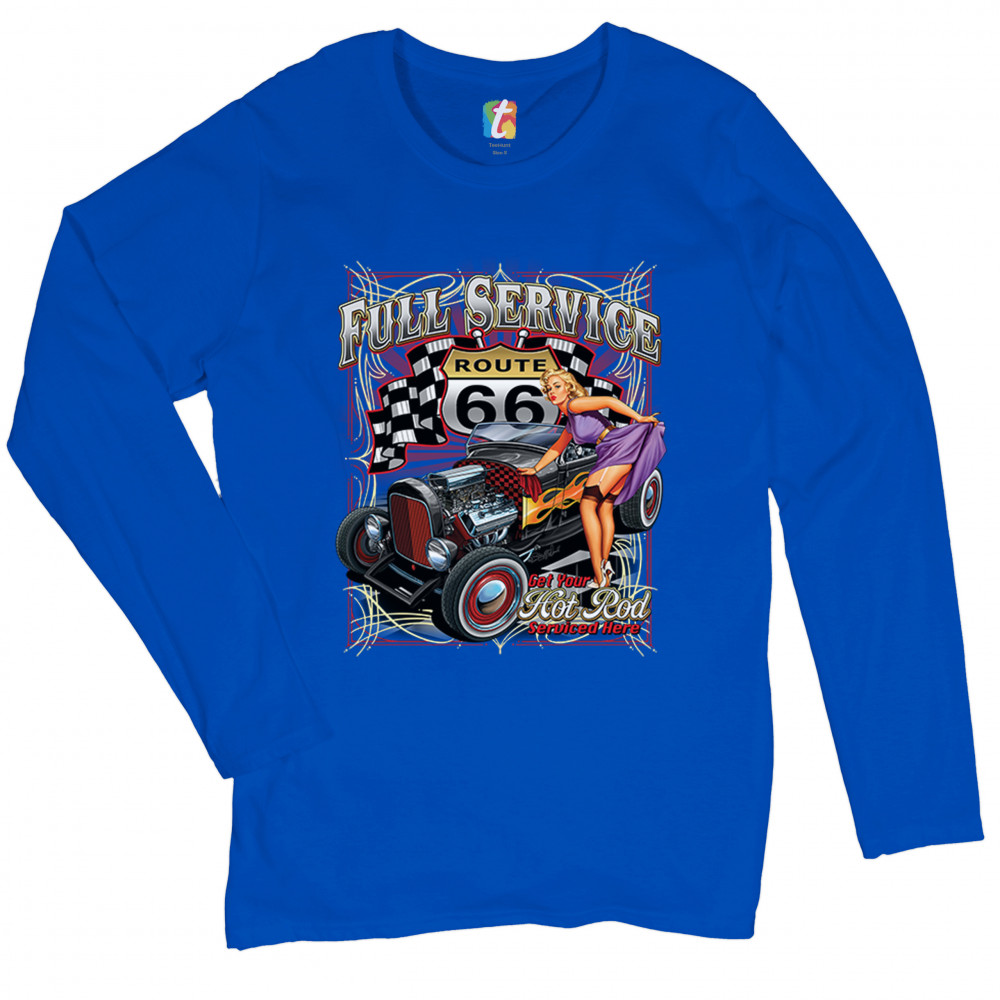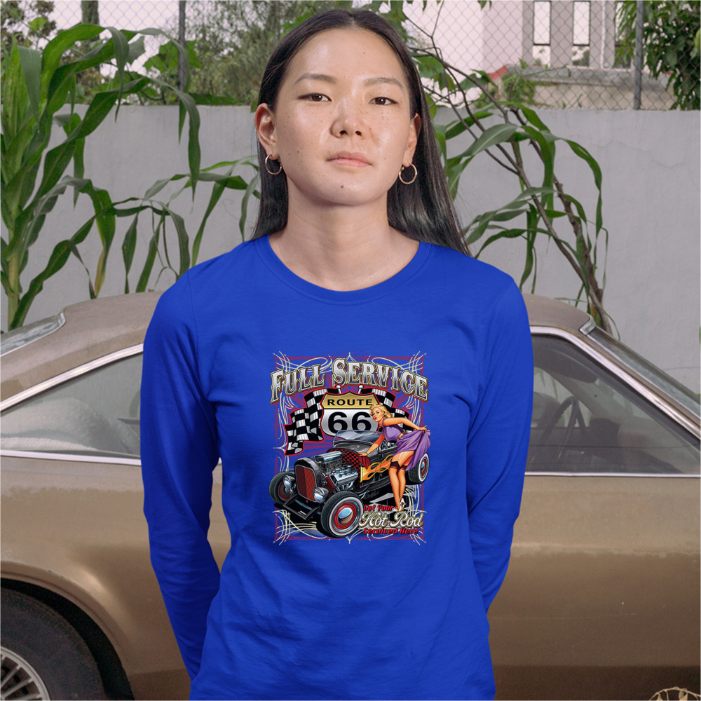 A print featuring a hot rod muscle car with flames painted on it's sides. There is a beautiful pin-up girl in stockings standing near it lifting her dress with one hand. The prints says: "full service" and "get your hot rod serviced here". In the background there is a Route 66 sign with racing flags to it's sides. Great for Route 66 and hot rod fans.
