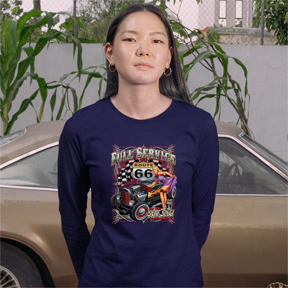 A print featuring a hot rod muscle car with flames painted on it's sides. There is a beautiful pin-up girl in stockings standing near it lifting her dress with one hand. The prints says: "full service" and "get your hot rod serviced here". In the background there is a Route 66 sign with racing flags to it's sides. Great for Route 66 and hot rod fans.