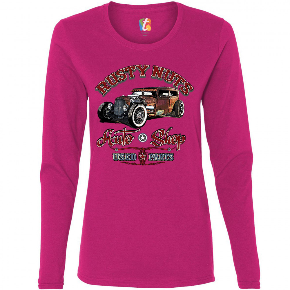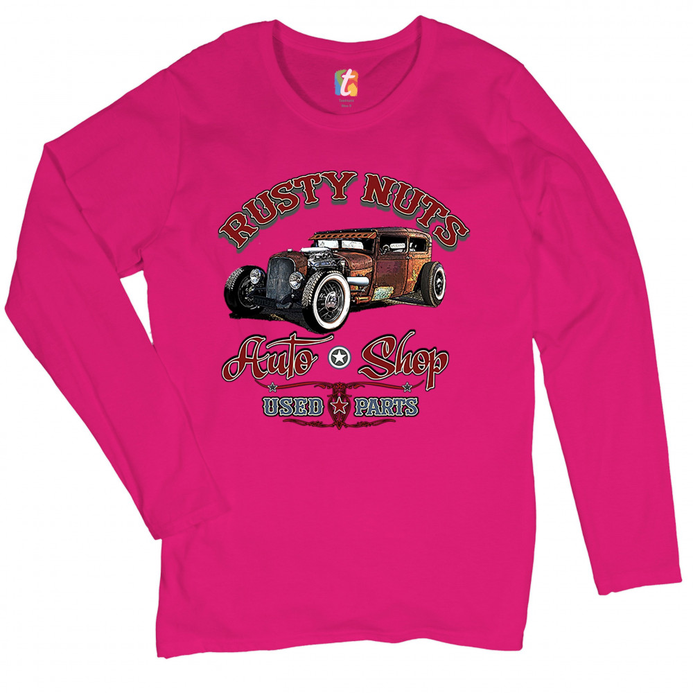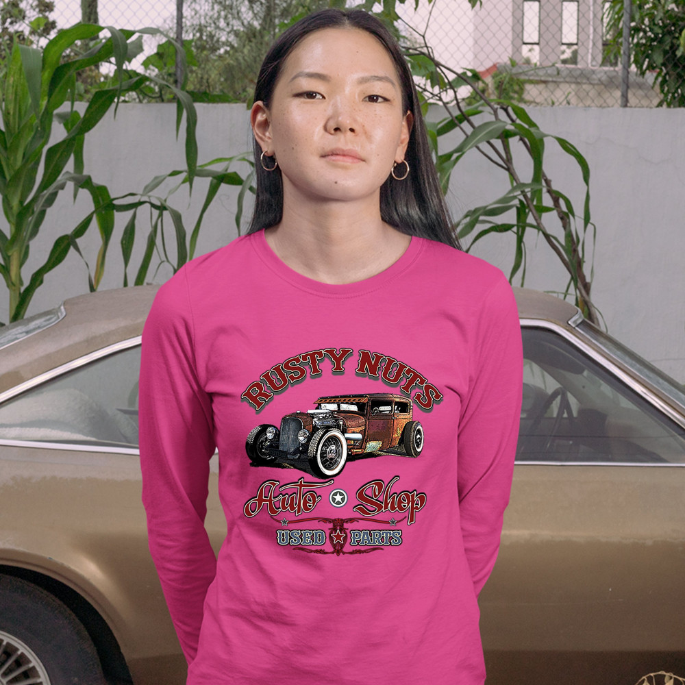 RUSTY NUTS AUTO SHOP women's long sleeve t-shirt hot rod rat rod old school pink