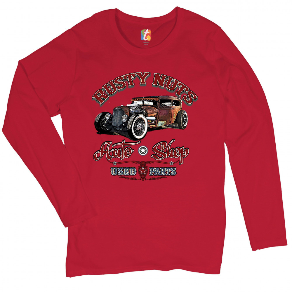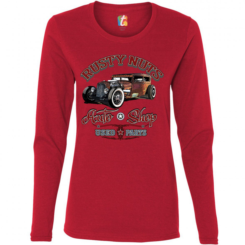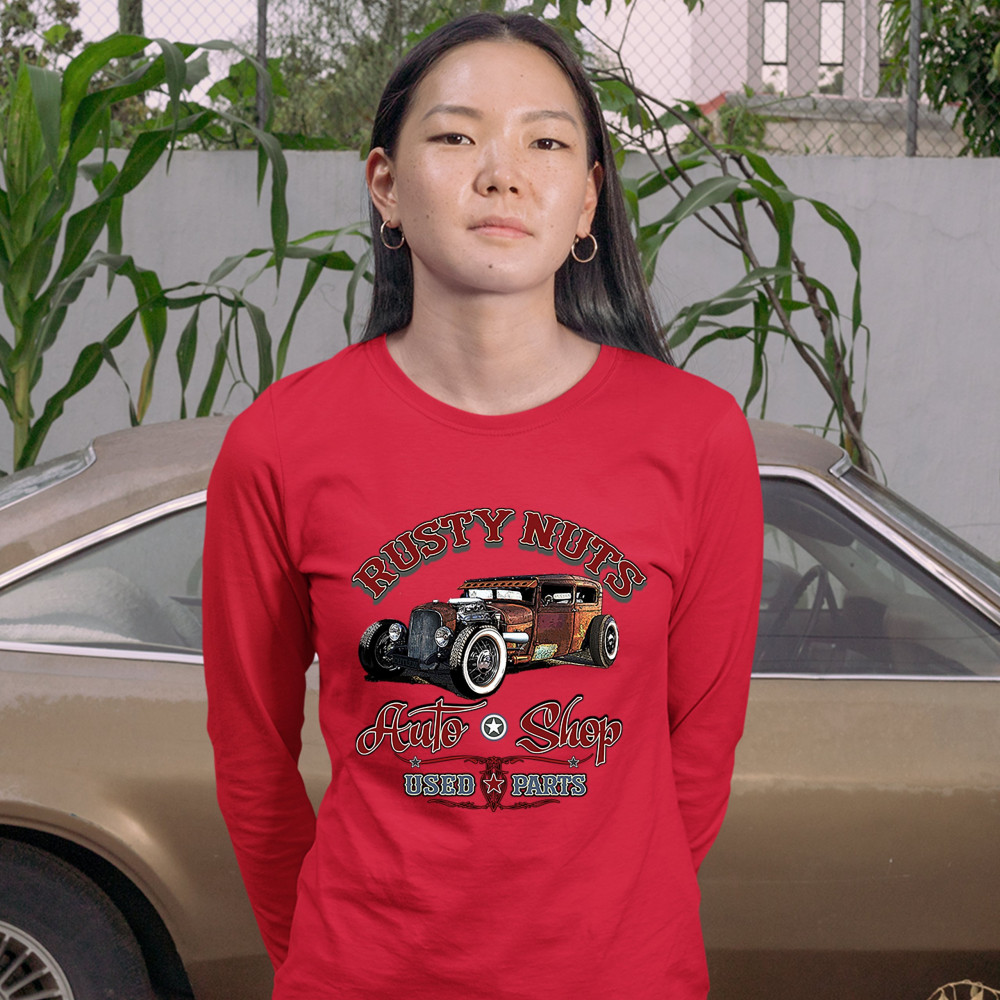 RUSTY NUTS AUTO SHOP women's long sleeve t-shirt hot rod rat rod old school red