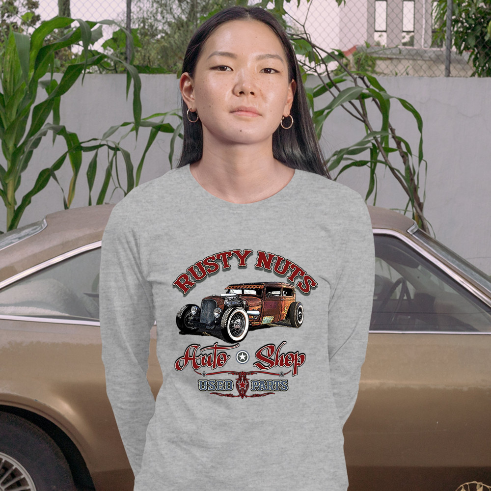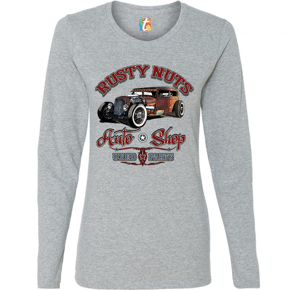 RUSTY NUTS AUTO SHOP women's long sleeve t-shirt hot rod rat rod old school gray