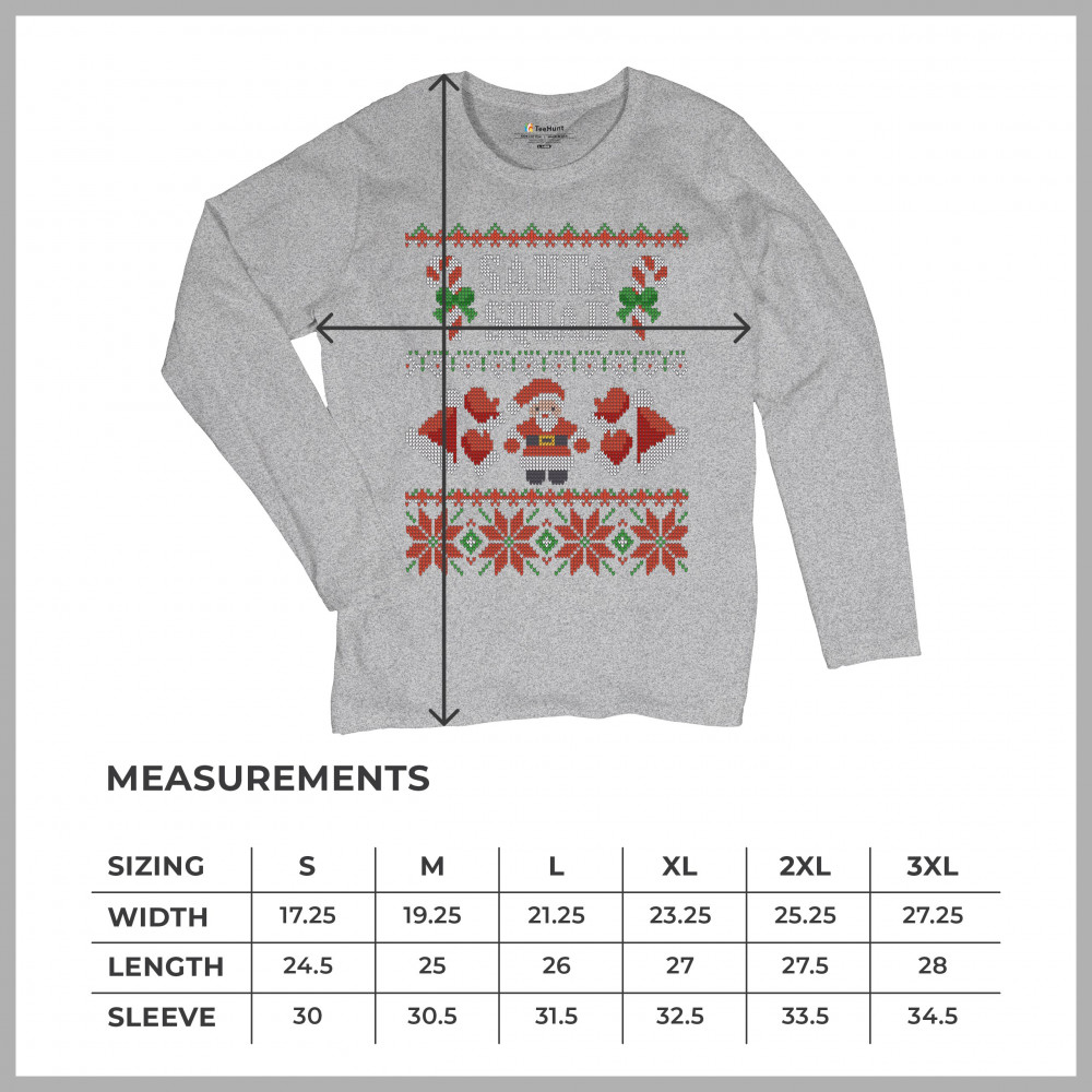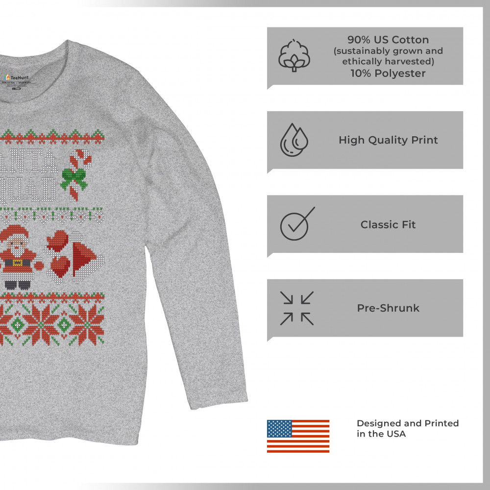 A cute print saying: "Santa Squad" and featuring 2 candy canes, 2 Christmas hats and 4 gloves. The print is decorated as an ugly sweater. Amazing choice to make people smile and spread positive vibes on Christmas Eve.