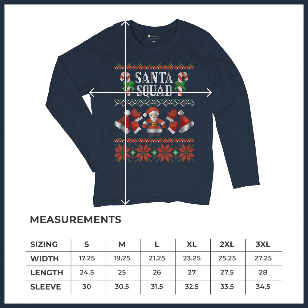 A cute print saying: "Santa Squad" and featuring 2 candy canes, 2 Christmas hats and 4 gloves. The print is decorated as an ugly sweater. Amazing choice to make people smile and spread positive vibes on Christmas Eve.