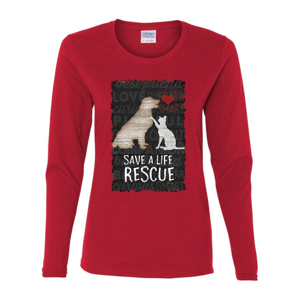 SAVE A LIFE rescue a pet women's long sleeve tee dog cat kitty puppy shelter paw red