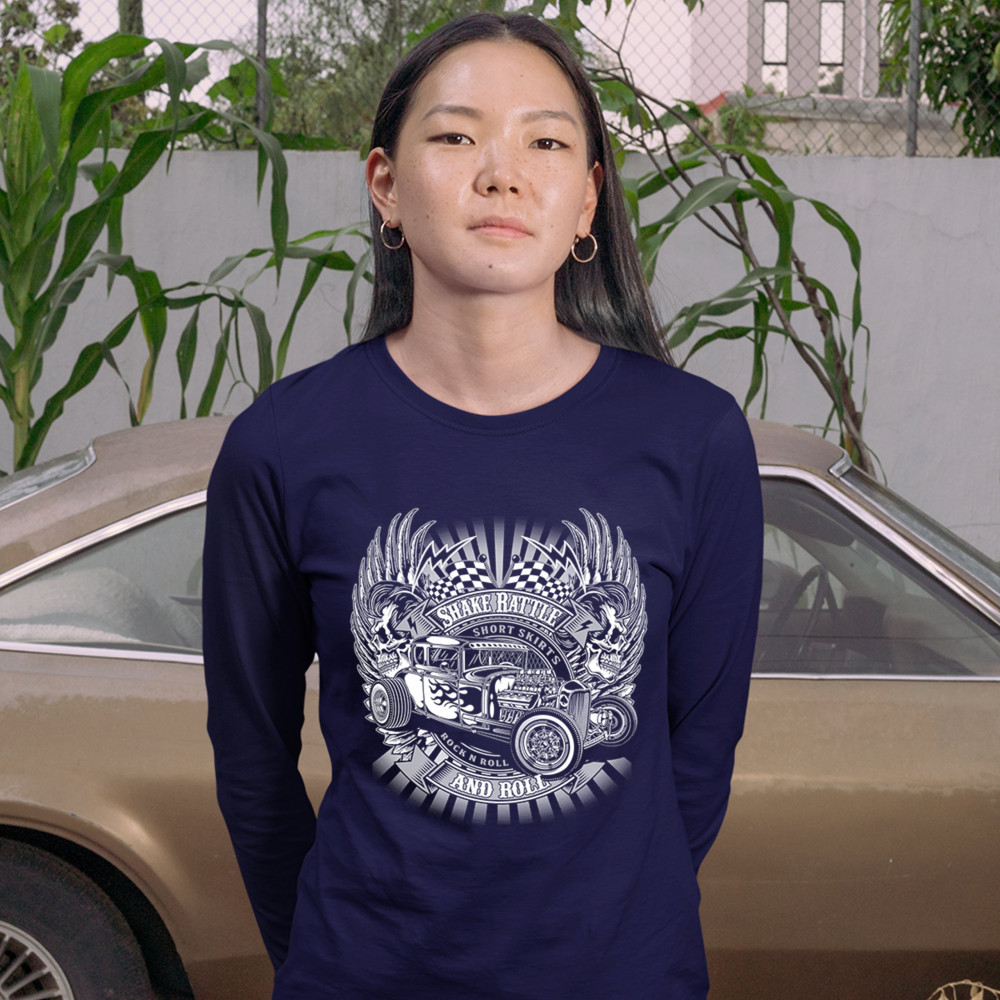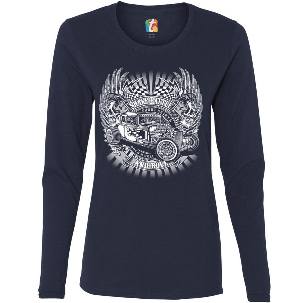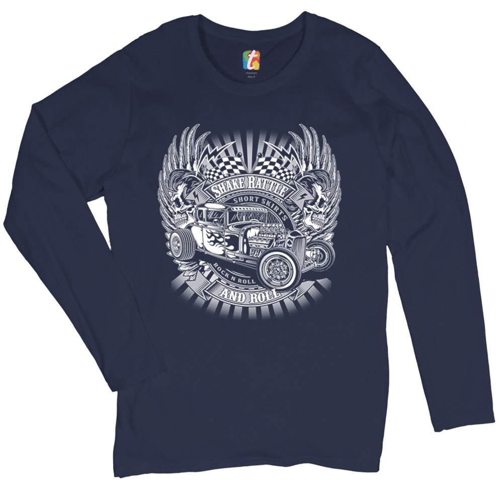 SHAKE RATTLE AND ROLL women's long sleeve t-shirt old school vintage hot rod navy blue
