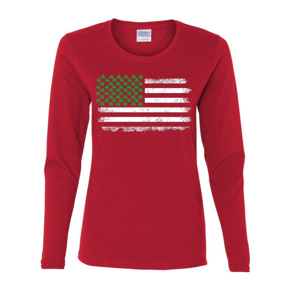SHAMROCK AMERICAN FLAG women's long sleeve tee stars and stripes st. patrick's red