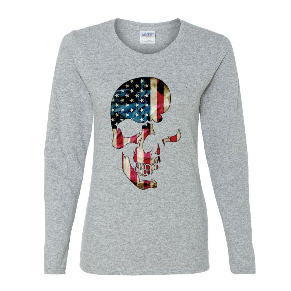SKULL AMERICANA women's long sleeve tee patriotic 4th of july stars and stripes gray