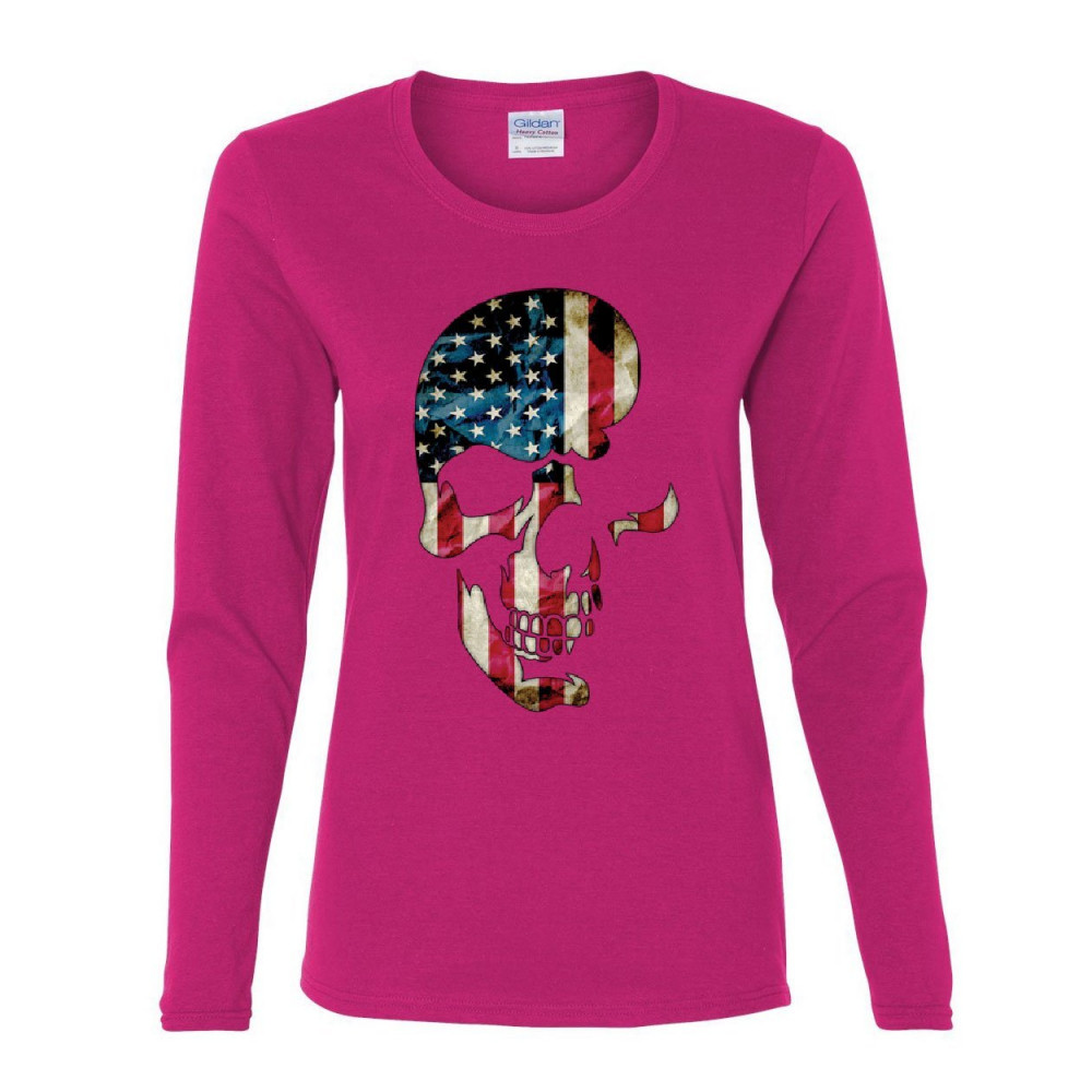 SKULL AMERICANA women's long sleeve tee patriotic 4th of july stars and stripes pink