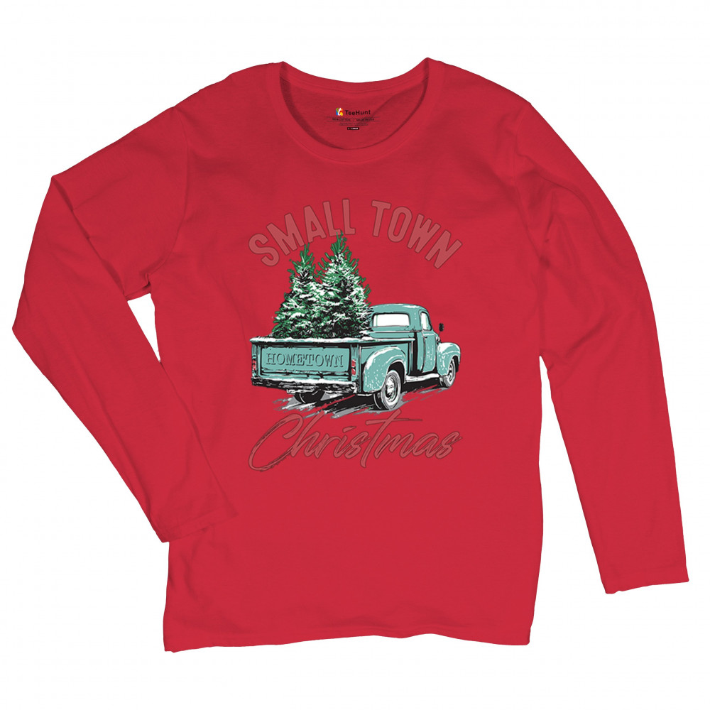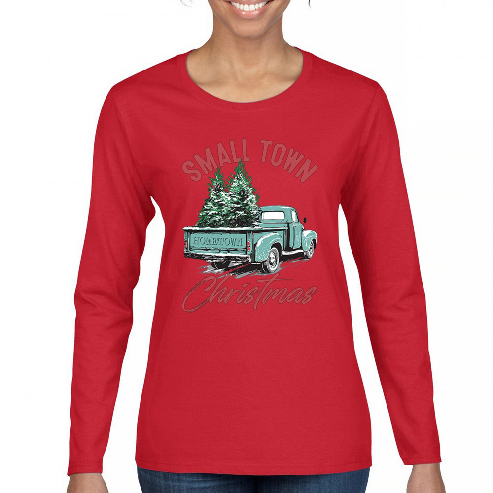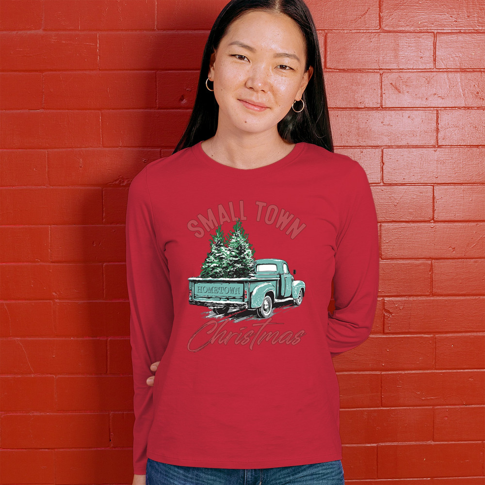 Embrace holiday nostalgia with this "Small Town Christmas" design featuring a vintage truck and Christmas trees. Perfect for rustic decor lovers.