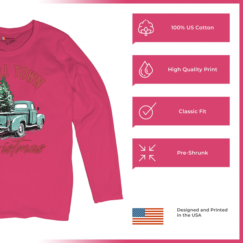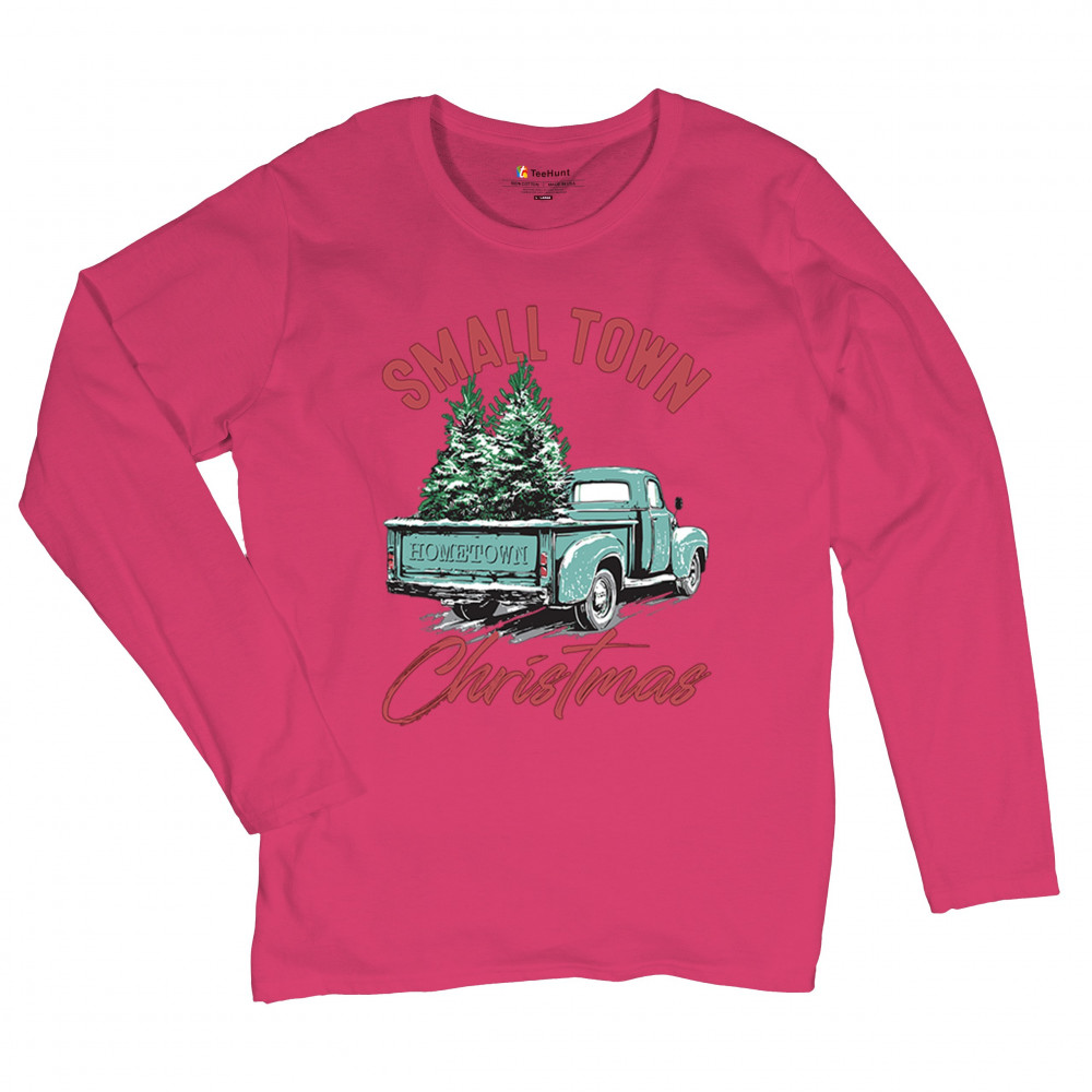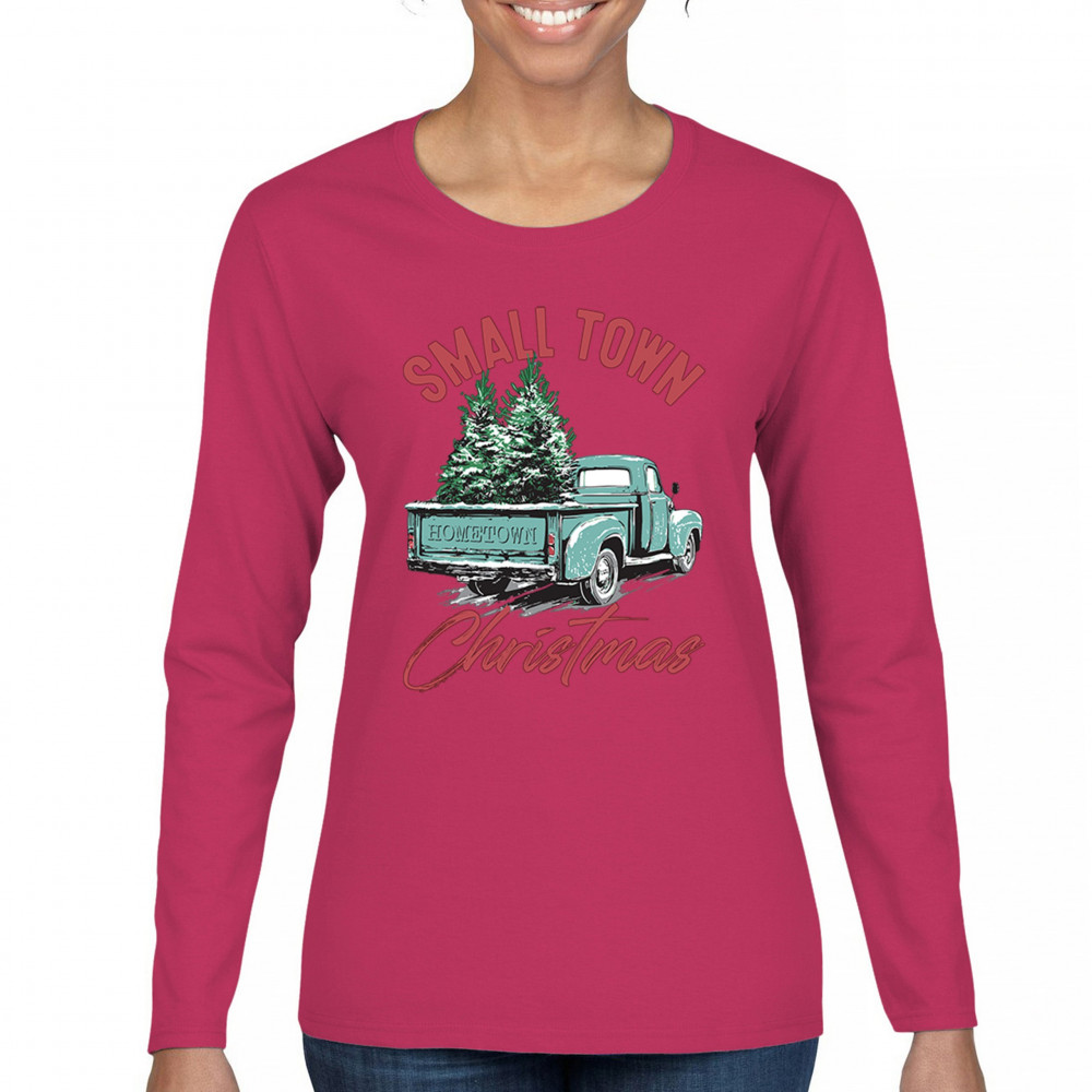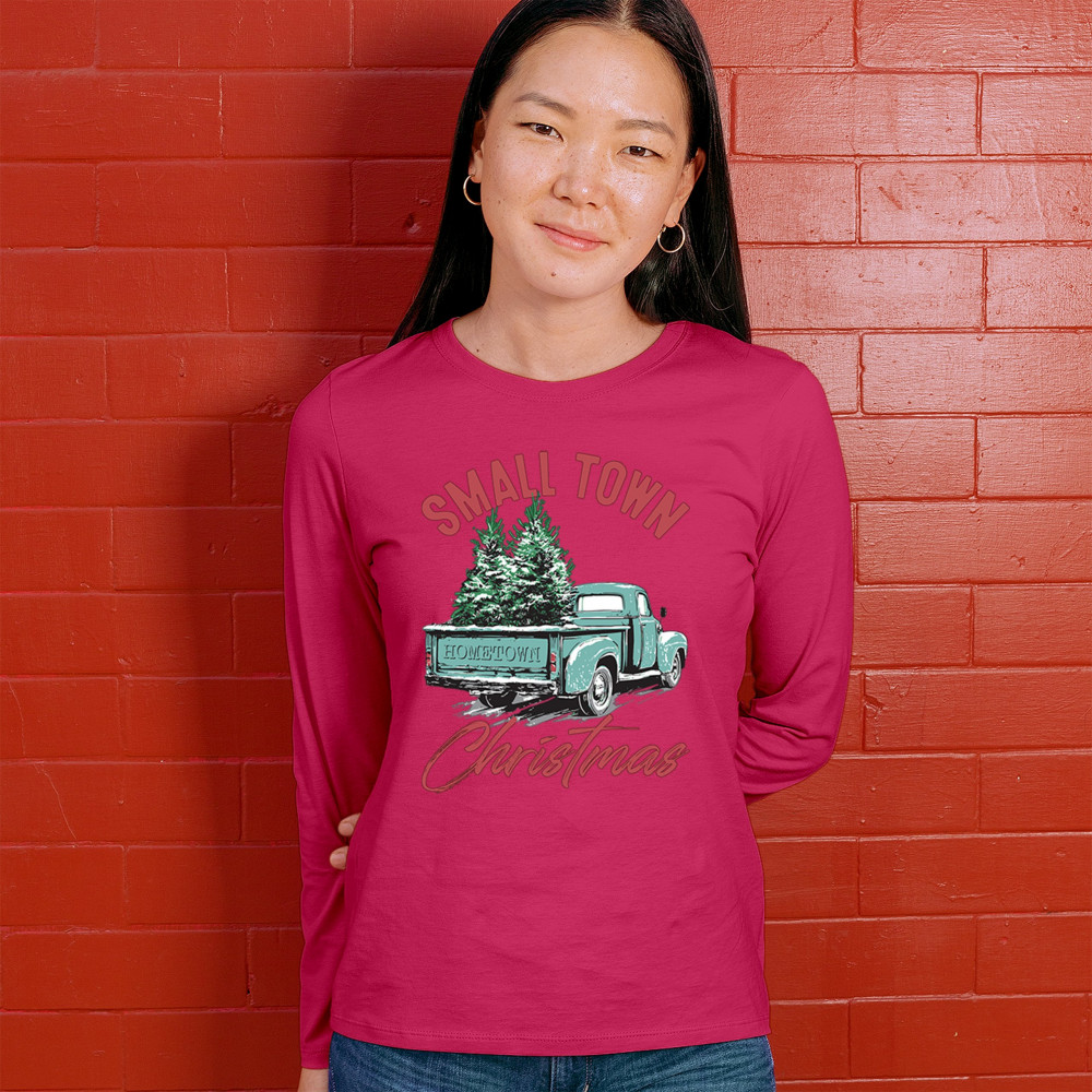 Embrace holiday nostalgia with this "Small Town Christmas" design featuring a vintage truck and Christmas trees. Perfect for rustic decor lovers.