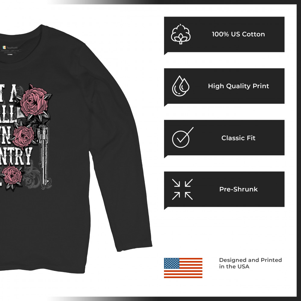 Celebrate small town southern pride with a country girl design that fuses rose florals and revolver grit. Perfect for cowgirls, rodeo nights, and barn parties, this rustic western graphic brings bold style and rural charm together. Great for anyone proud of their roots and hometown life.