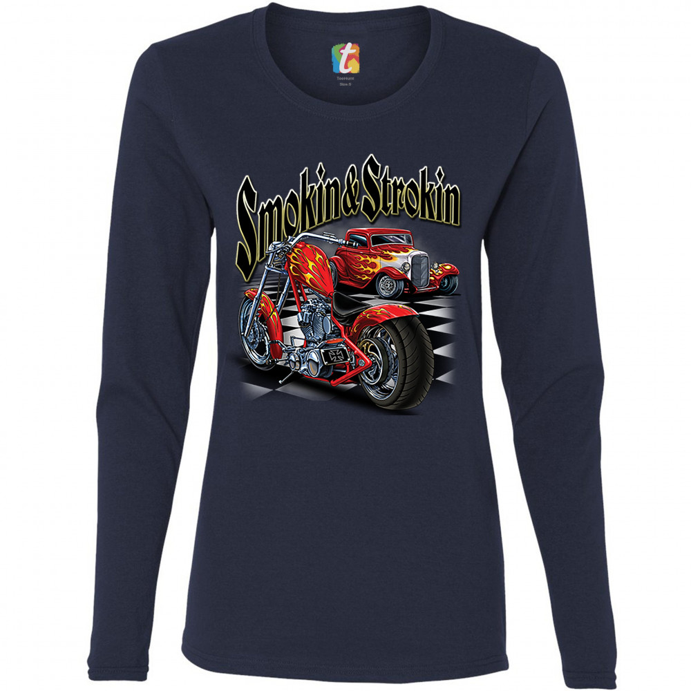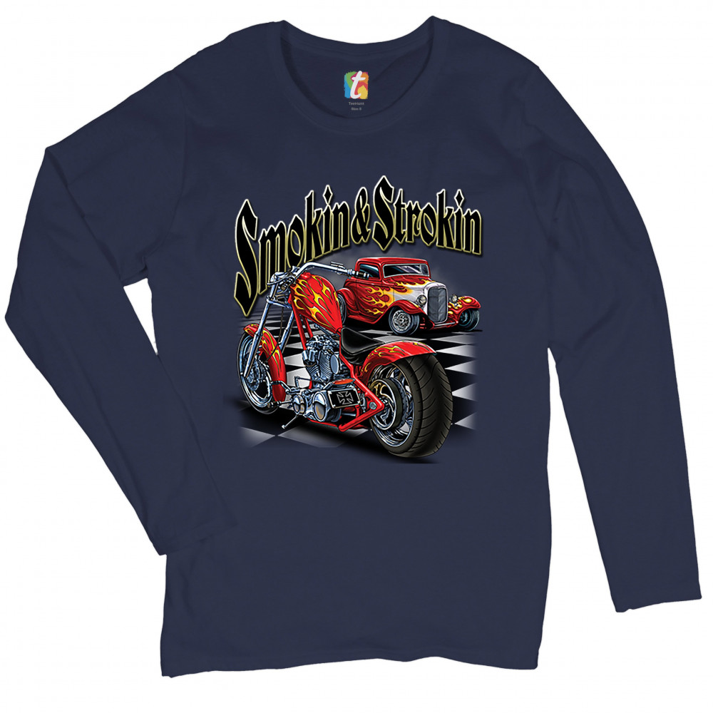 SMOKIN & STROKIN women's long sleeve t-shirt chopper biker hot rod live to ride navy blue