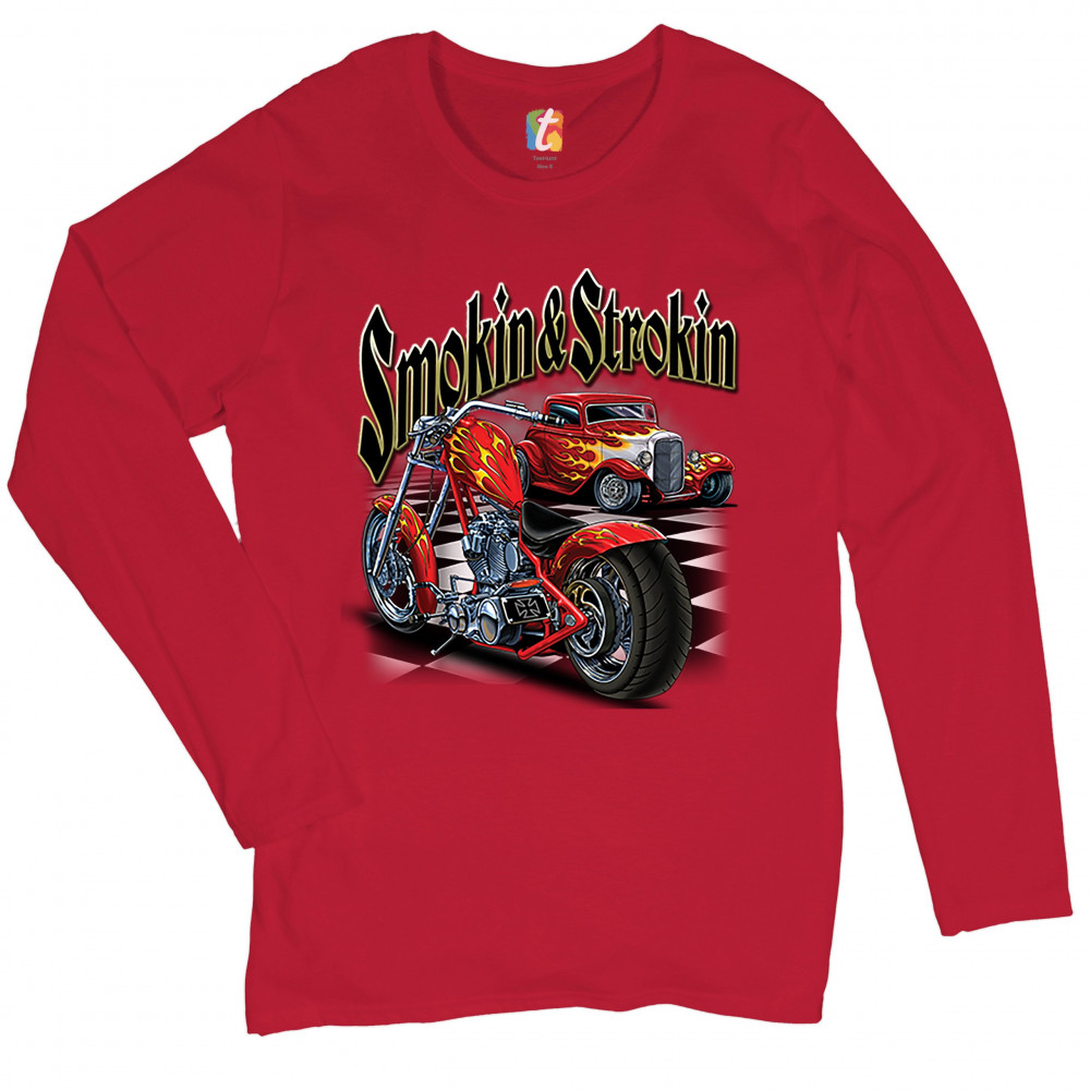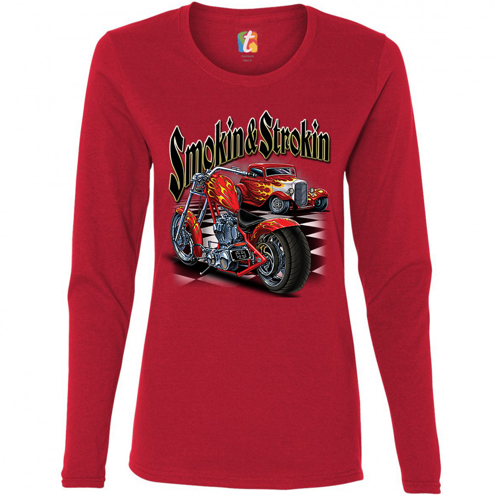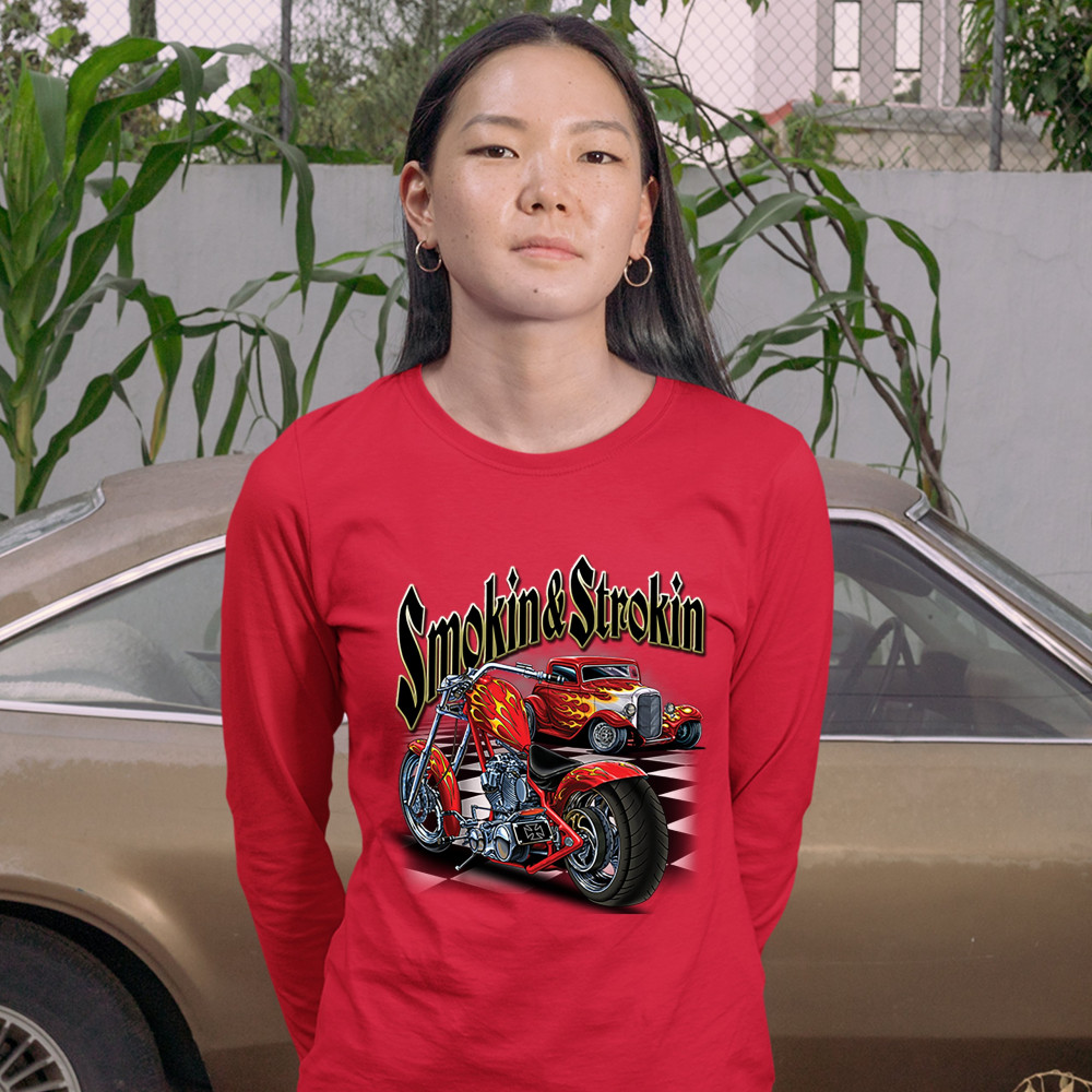 SMOKIN & STROKIN women's long sleeve t-shirt chopper biker hot rod live to ride red