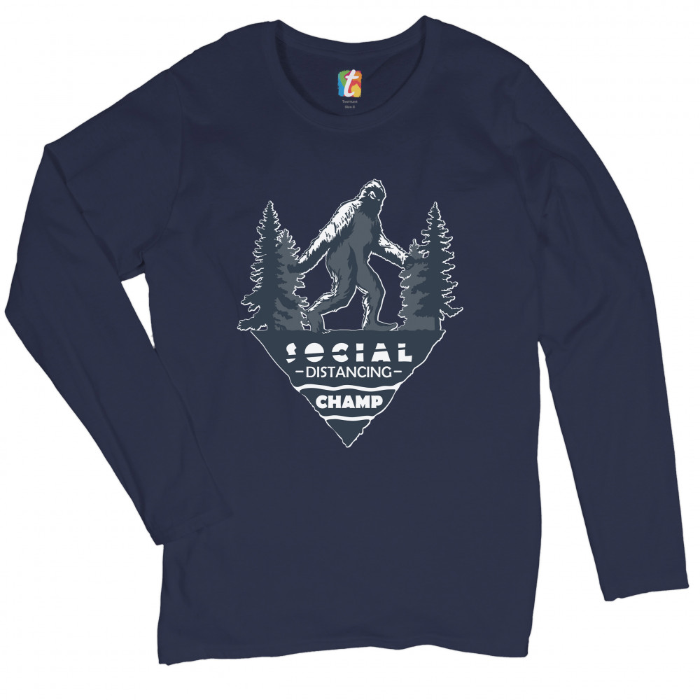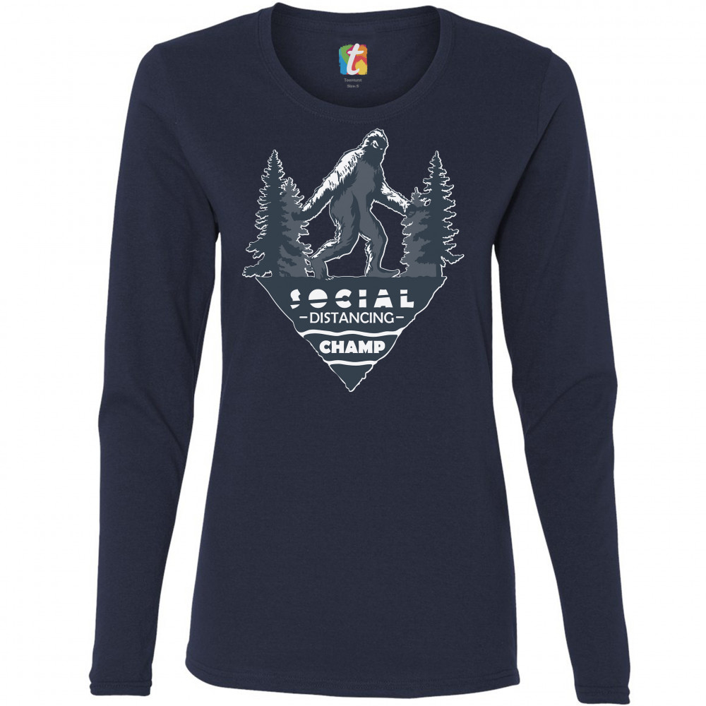 SOCIAL DISTANCING CHAMP women's long sleeve t-shirt bigfoot yeti quarantine navy blue