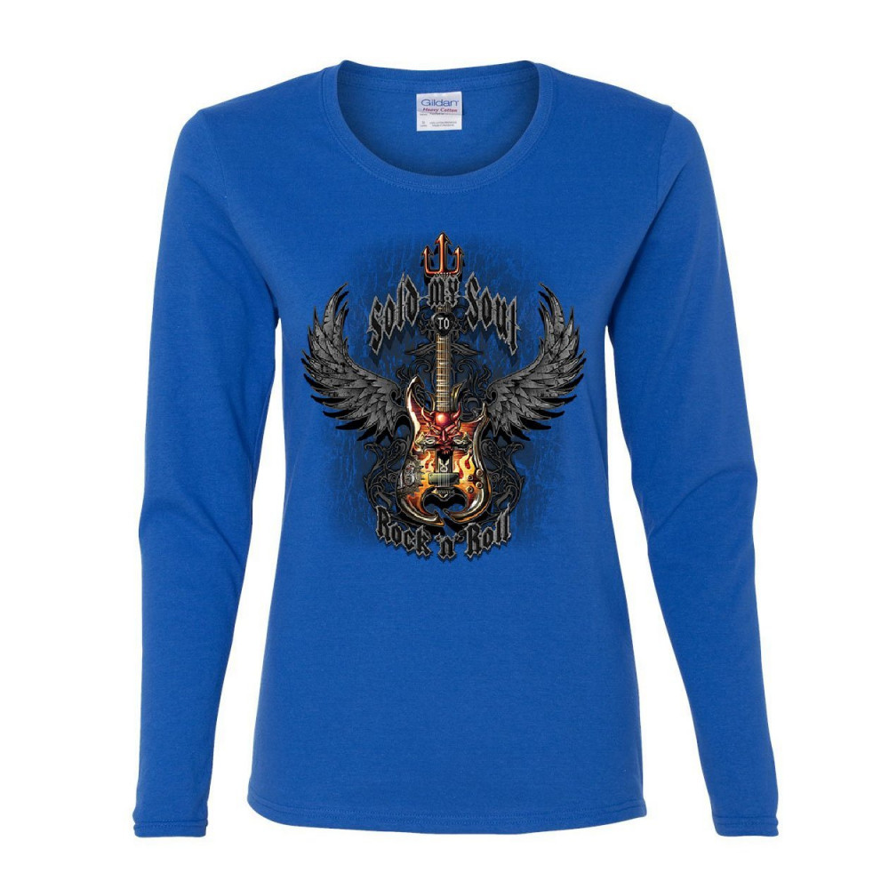 SOLD MY SOUL TO ROCK & ROLL women's long sleeve tee demon guitar wings trident royal blue