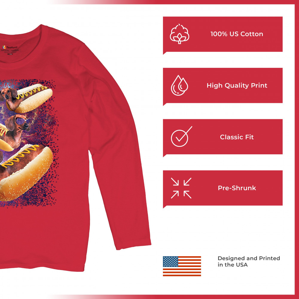 Add a dash of humor to your wardrobe with our unique design featuring adorable dachshunds as hotdogs in a cosmic setting. This playful graphic is perfect for animal lovers and those with a quirky sense of style. The vibrant colors and detailed illustration ensure you stand out in any crowd. Made from premium materials, this tee offers both comfort and durability, making it ideal for everyday wear or special occasions. Embrace your love for dogs and space with this fun and imaginative design.