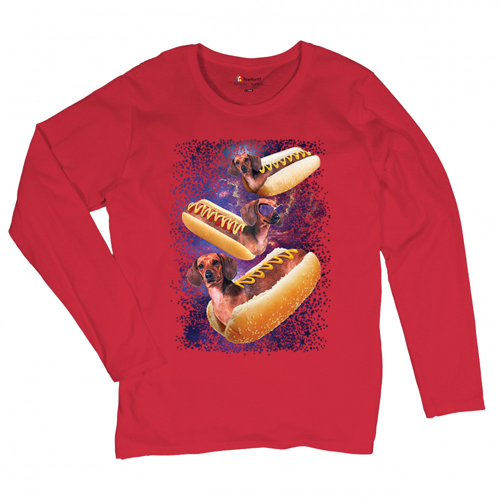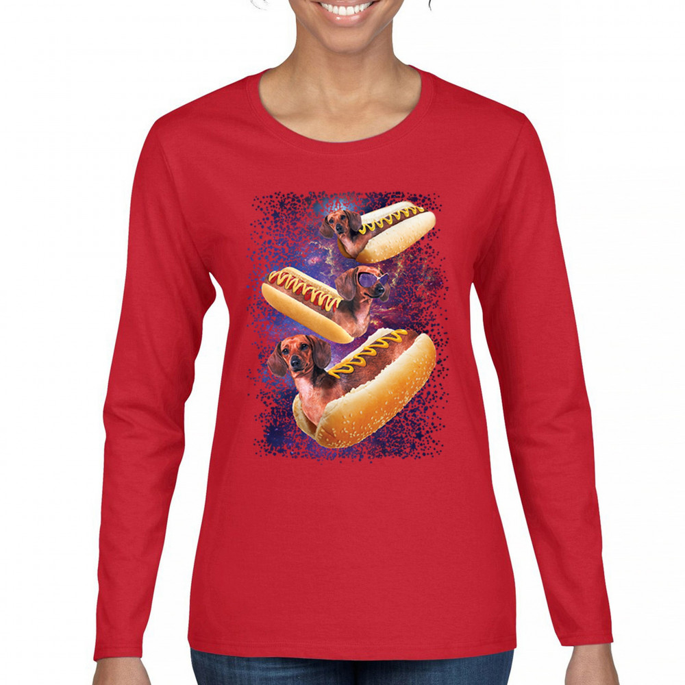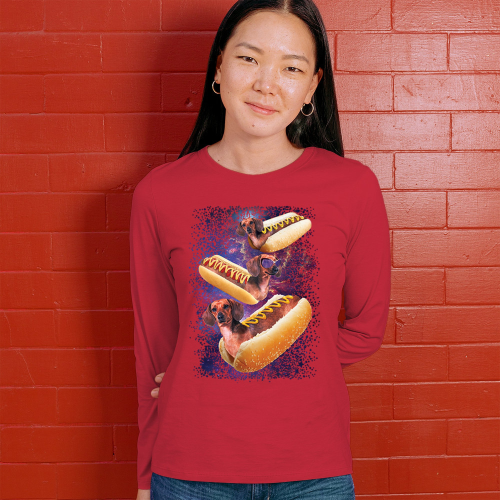 Quirky and fun tee featuring dachshunds as hotdogs in a cosmic setting. Perfect for dog and space lovers. Comfortable and durable.