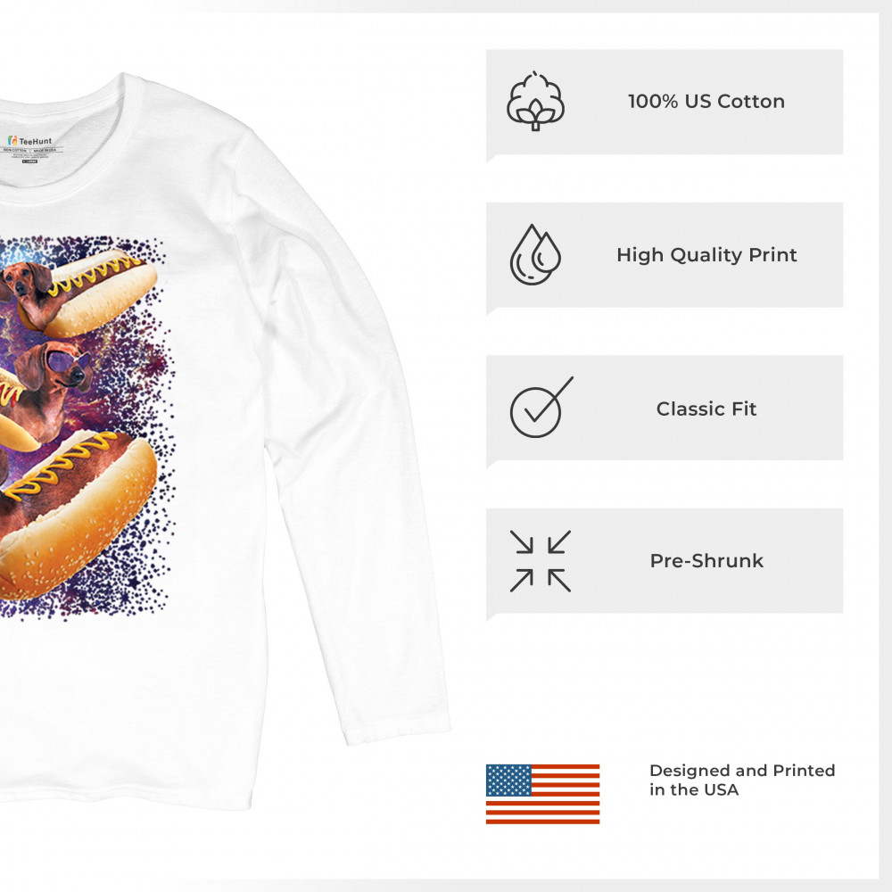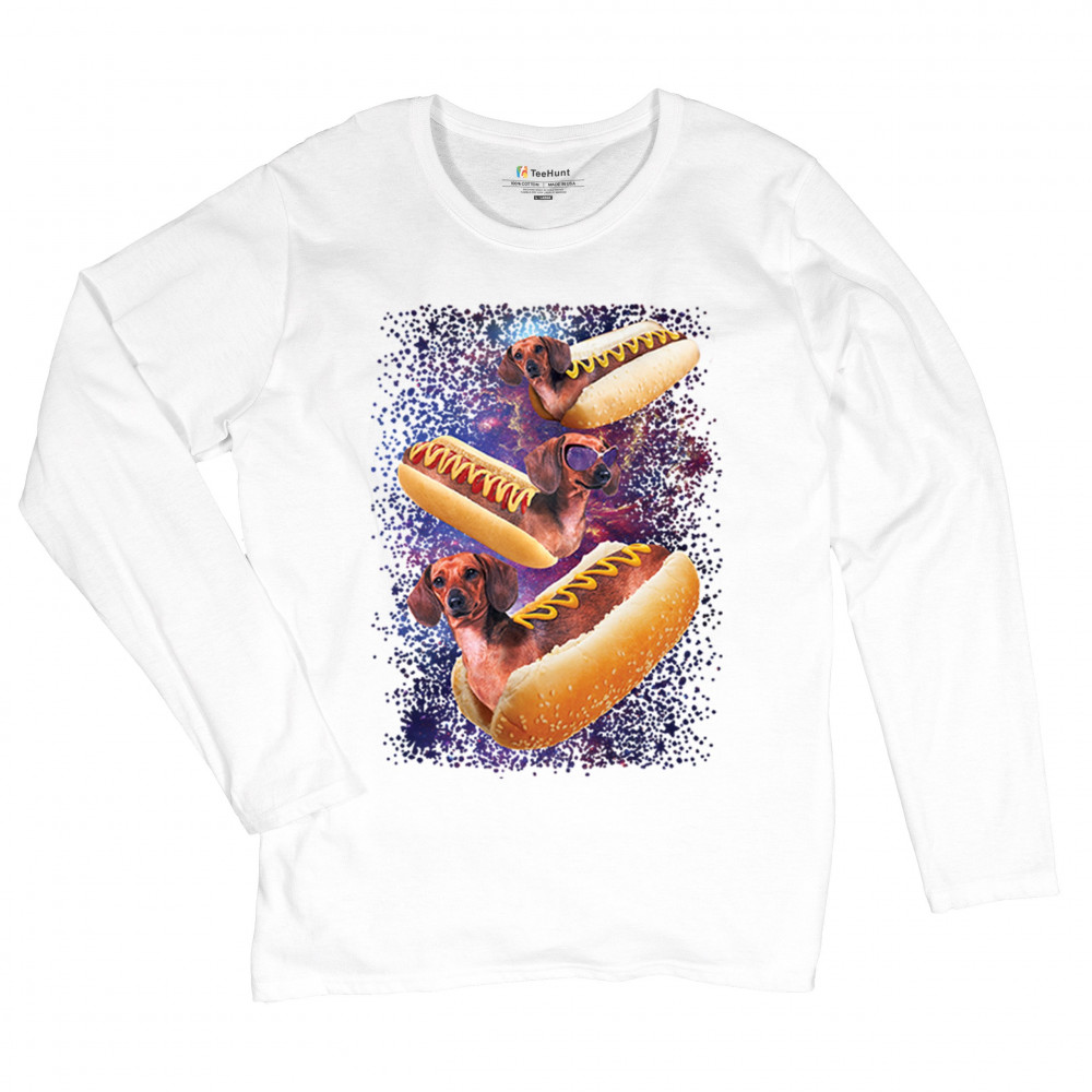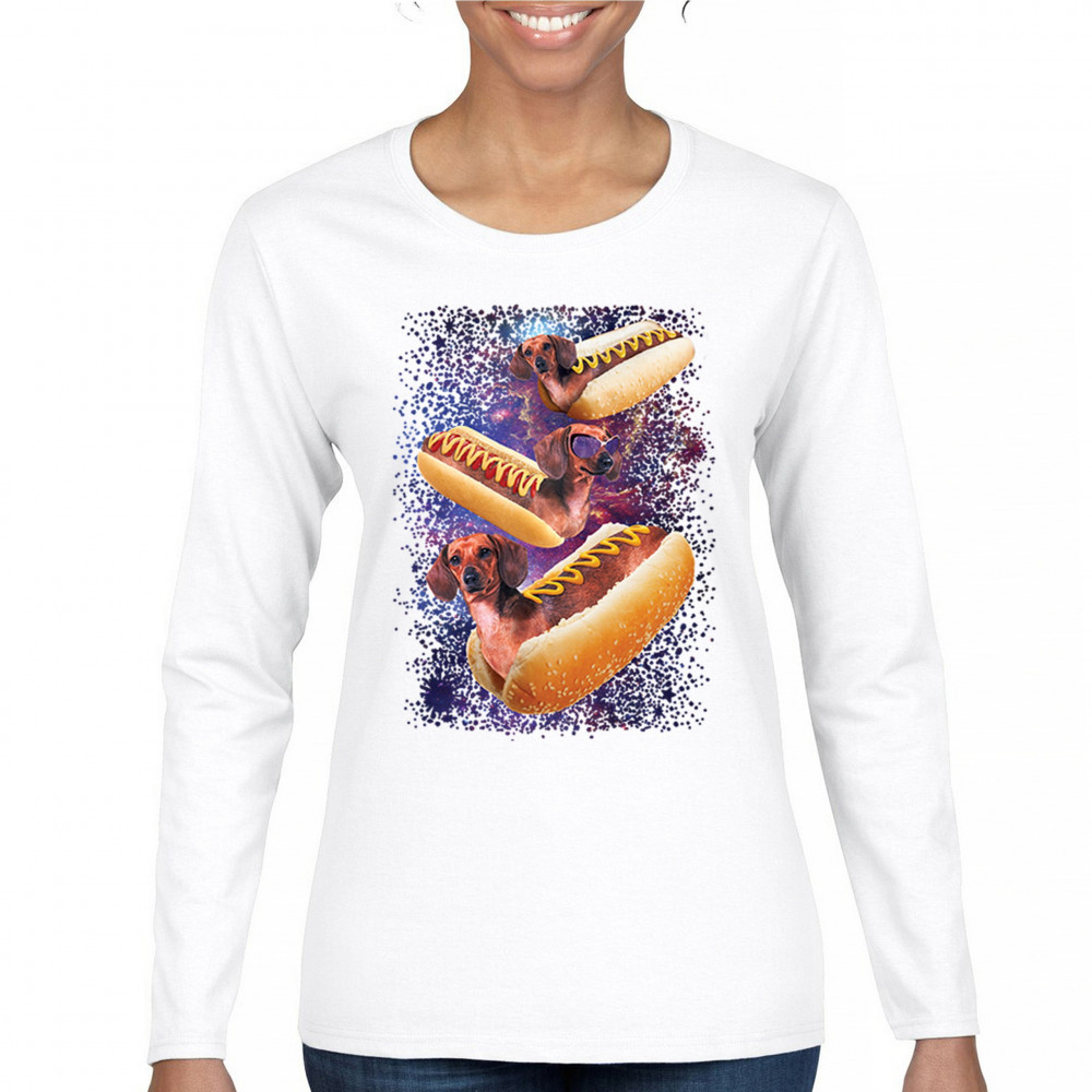 Quirky and fun tee featuring dachshunds as hotdogs in a cosmic setting. Perfect for dog and space lovers. Comfortable and durable.