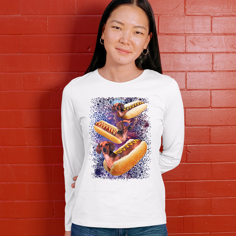 Add a dash of humor to your wardrobe with our unique design featuring adorable dachshunds as hotdogs in a cosmic setting. This playful graphic is perfect for animal lovers and those with a quirky sense of style. The vibrant colors and detailed illustration ensure you stand out in any crowd. Made from premium materials, this tee offers both comfort and durability, making it ideal for everyday wear or special occasions. Embrace your love for dogs and space with this fun and imaginative design.