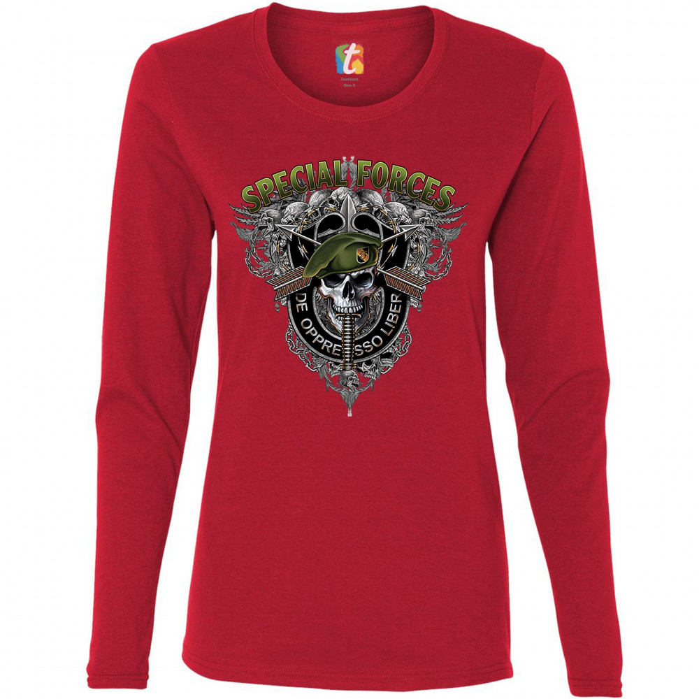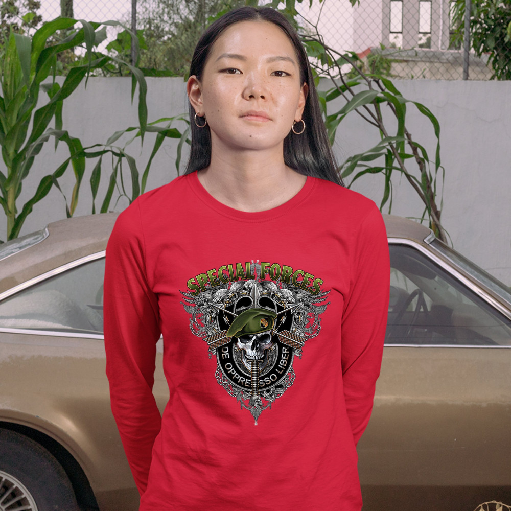 A patriotic print featuring a skull wearing a green beret with a dagger in it's mouth. At the top the print says: "Special Forces". Around the skull there is a black stripe with the special forces' slogan written on it: "de oppresso liber". In the backgro
