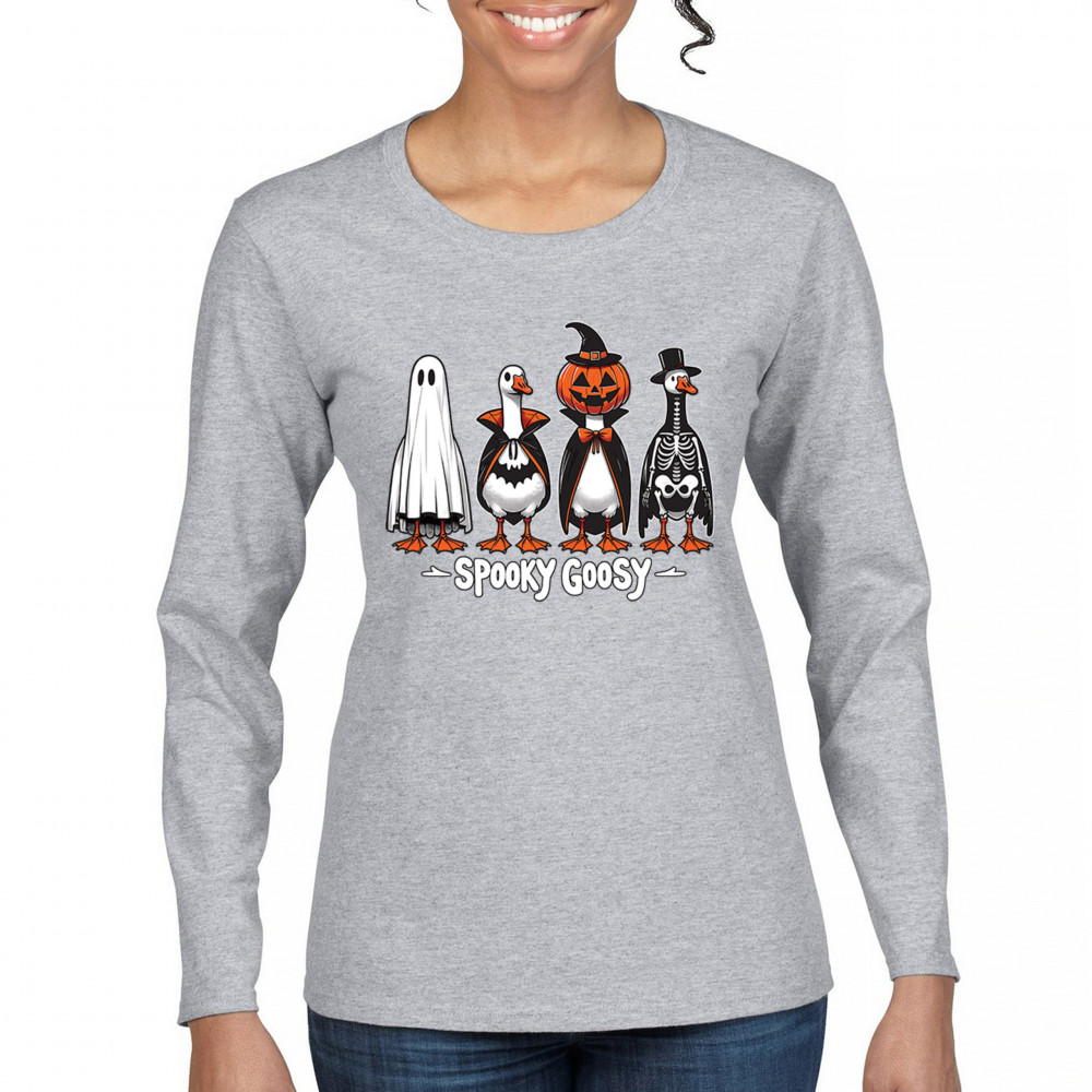 Spooky Goosy Halloween design with geese in witch, skeleton, vampire, and pumpkin costumes. Perfect for October 31, haunted house, and scary night fun.