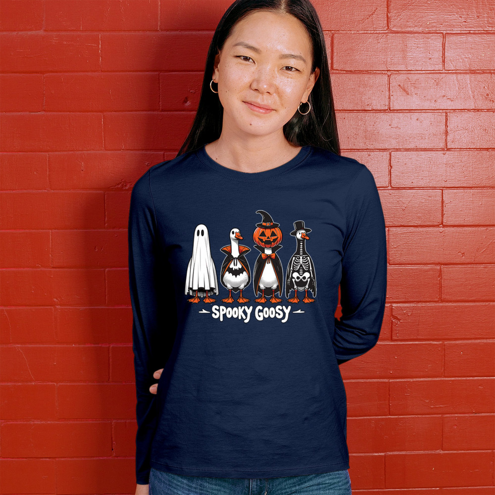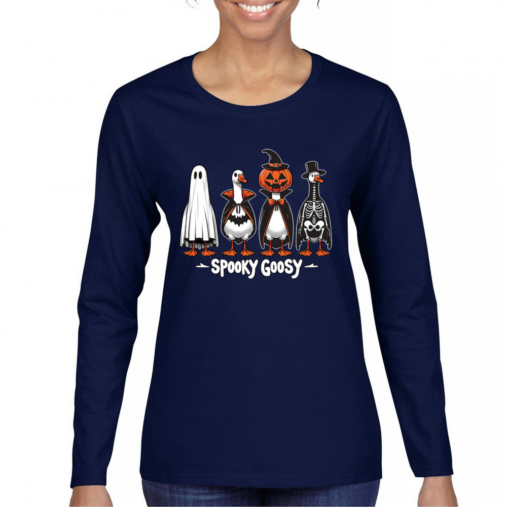 Spooky Goosy Halloween design with geese in witch, skeleton, vampire, and pumpkin costumes. Perfect for October 31, haunted house, and scary night fun.