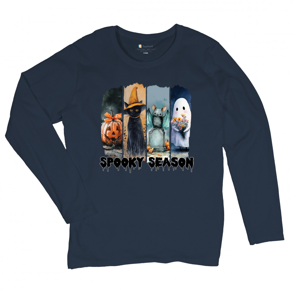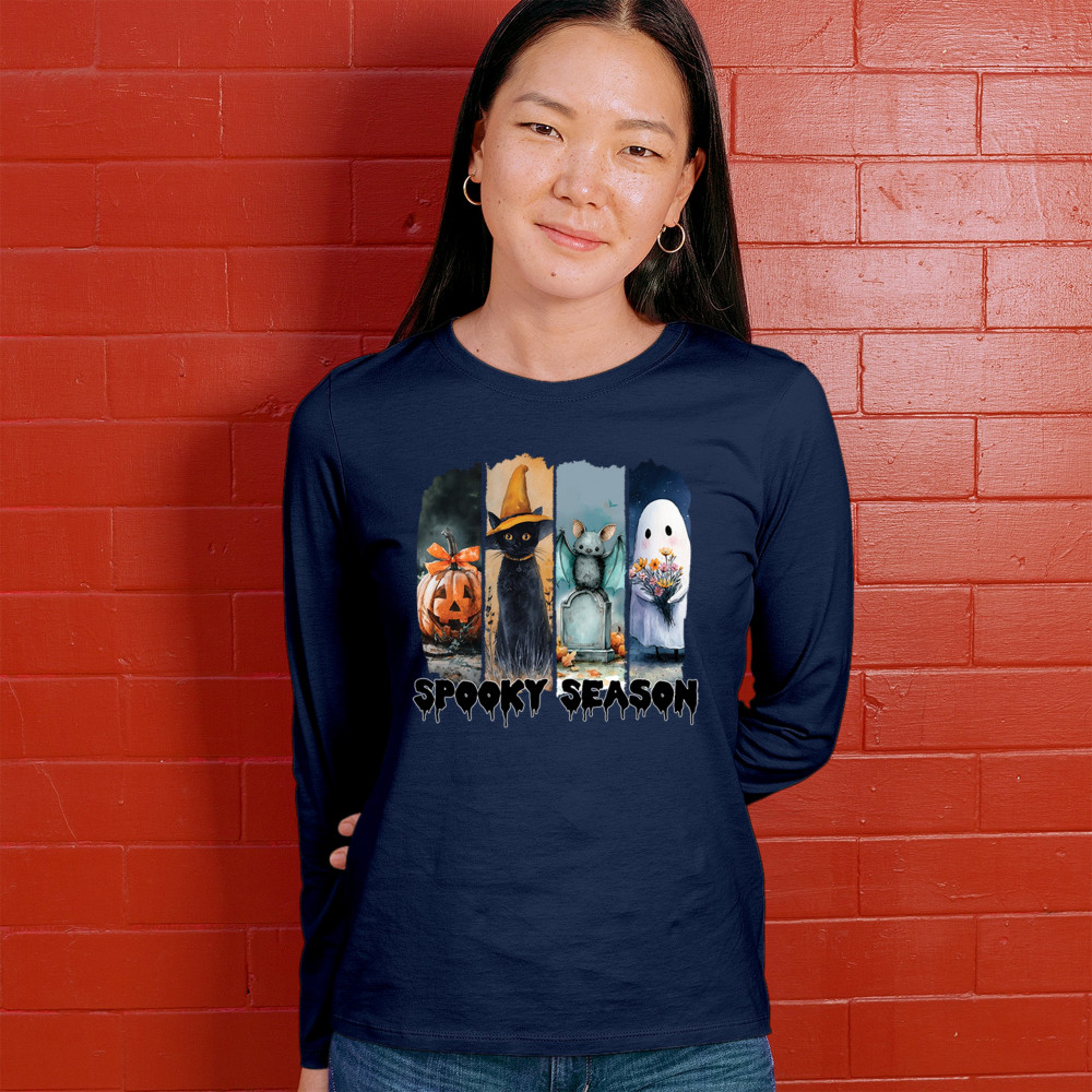 Spooky Season design with scary black cat, jack o lantern, haunted ghost house, and cute ghost. Perfect for October 31, trick or treat, and fall fun.
