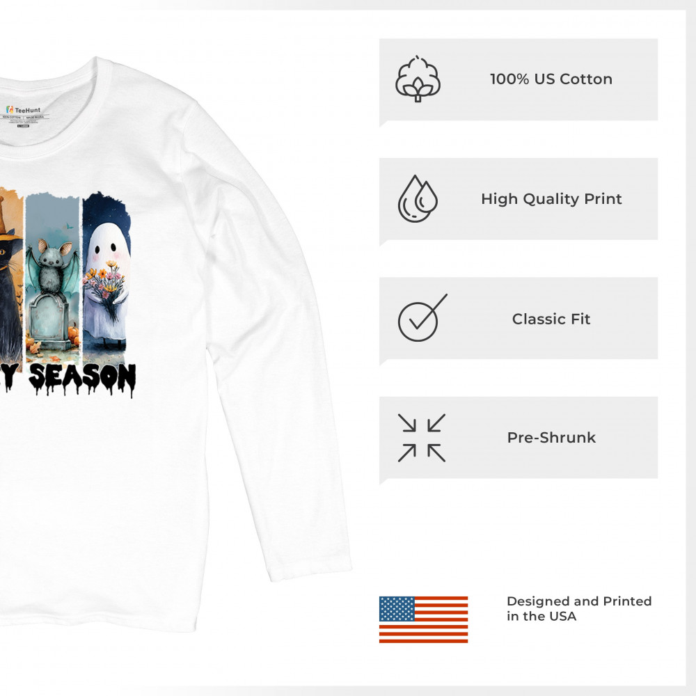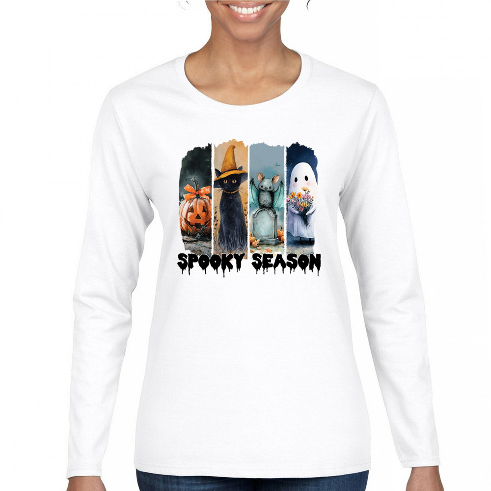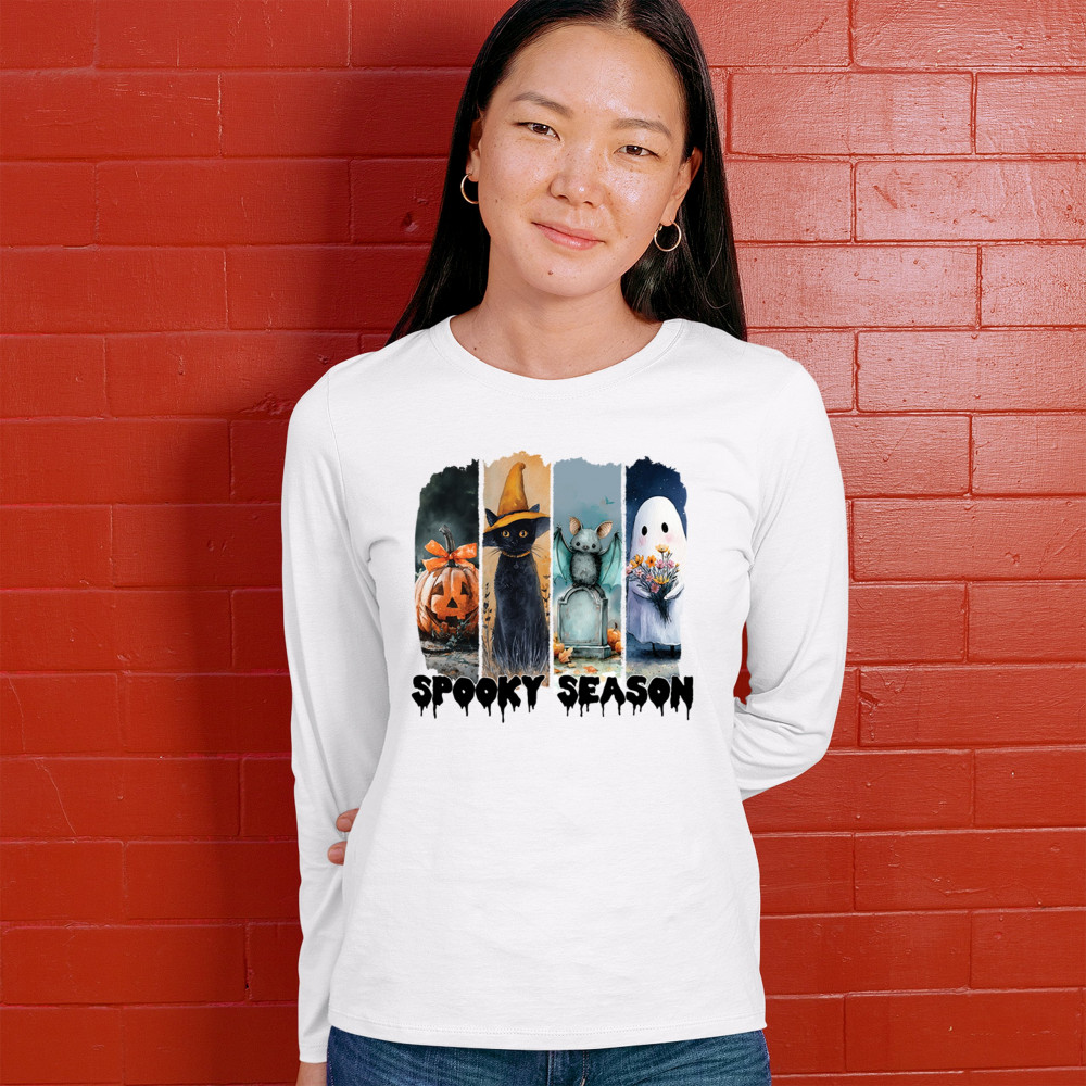 Spooky Season design with scary black cat, jack o lantern, haunted ghost house, and cute ghost. Perfect for October 31, trick or treat, and fall fun.