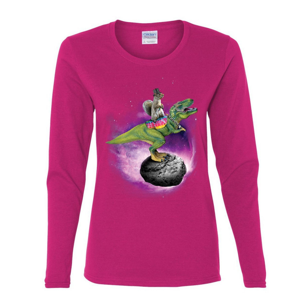 SQUIRREL RIDING T-REX RIDING ASTEROID women's long sleeve tee funny space weird pink