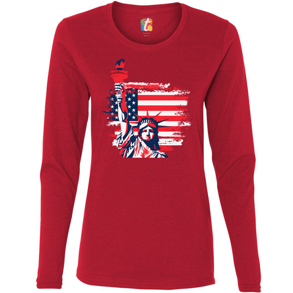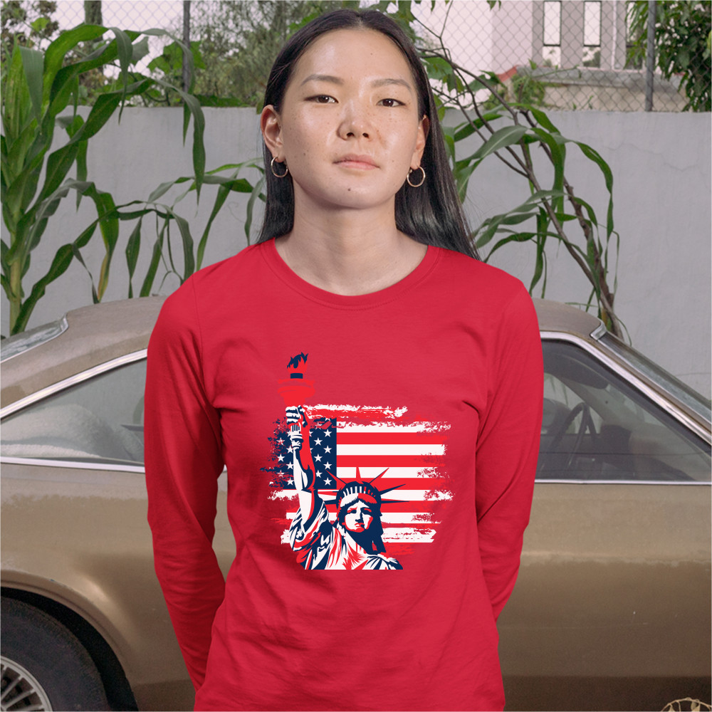 A patriotic print featuring a dripping silhouette of a bald eagle. The body is painted blue with lots of stars on it and the feathers of the wings, painted red, resemble the stripes of the American Flag. Over the wings there is a text written: "Land of the free home of the brave". Great choice to wear on Independence Day or any other patriotic holiday.