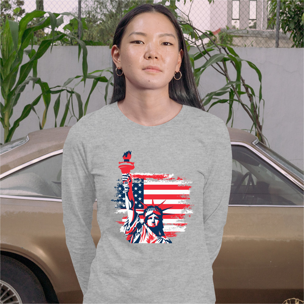 A patriotic print featuring a dripping silhouette of a bald eagle. The body is painted blue with lots of stars on it and the feathers of the wings, painted red, resemble the stripes of the American Flag. Over the wings there is a text written: "Land of the free home of the brave". Great choice to wear on Independence Day or any other patriotic holiday.