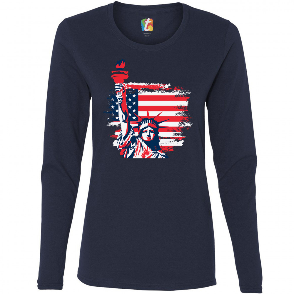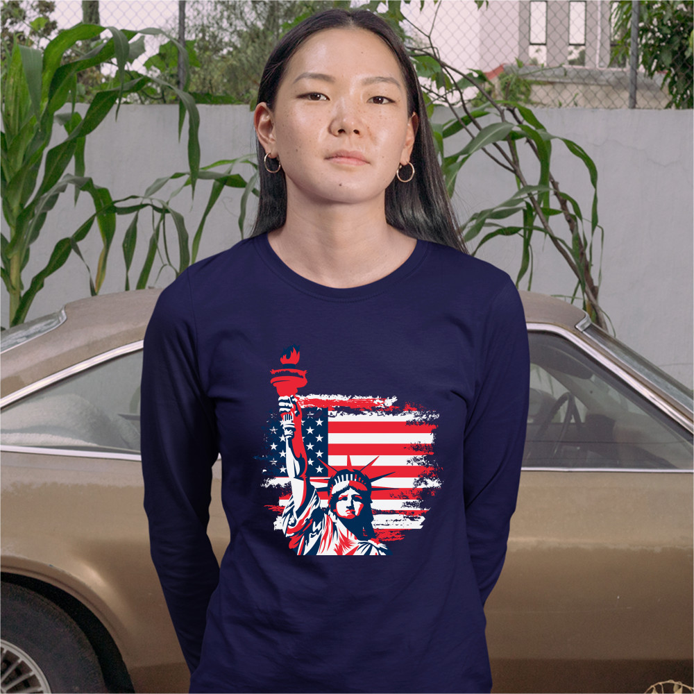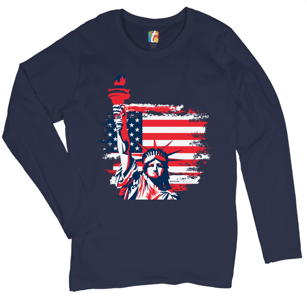 A patriotic print featuring a dripping silhouette of a bald eagle. The body is painted blue with lots of stars on it and the feathers of the wings, painted red, resemble the stripes of the American Flag. Over the wings there is a text written: "Land of the free home of the brave". Great choice to wear on Independence Day or any other patriotic holiday.