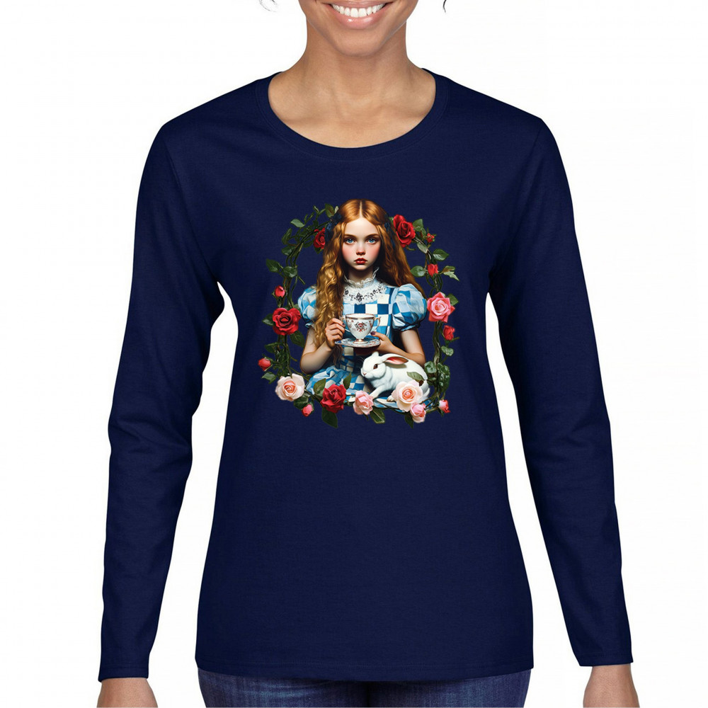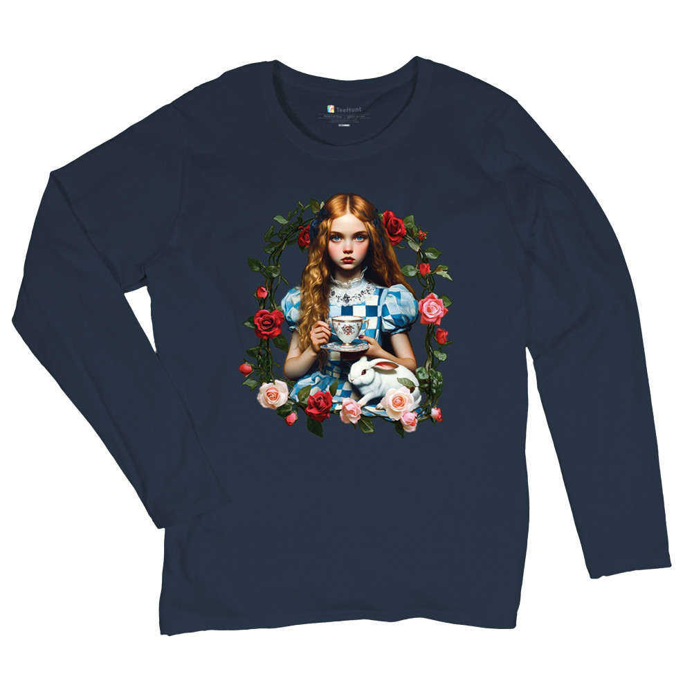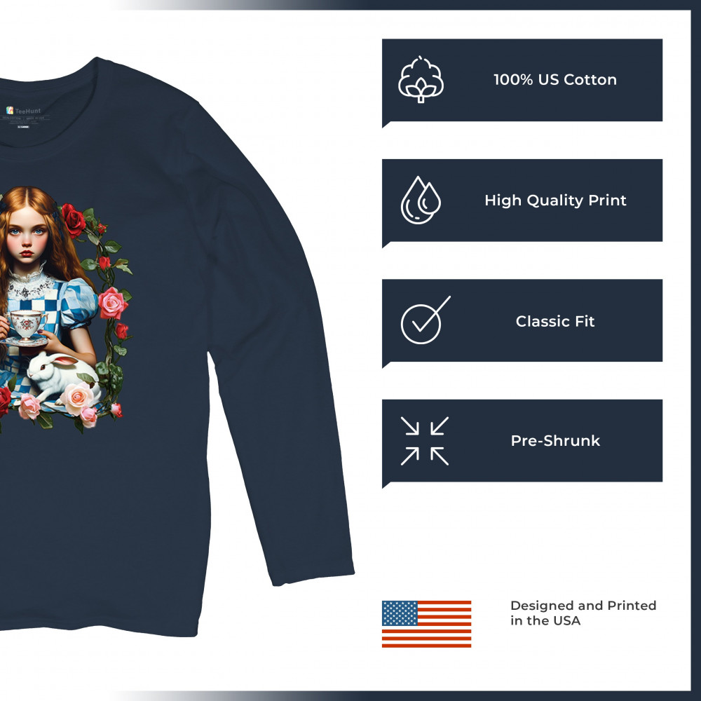 Step into a storybook dream with this Wonderland-inspired design featuring a young girl at a tea party with her white rabbit companion. Framed by roses, it evokes vintage charm, fantasy, and magical nostalgia. Ideal for bookworms, collectors, and lovers of fairytales, it blends whimsical elegance with timeless childhood wonder.