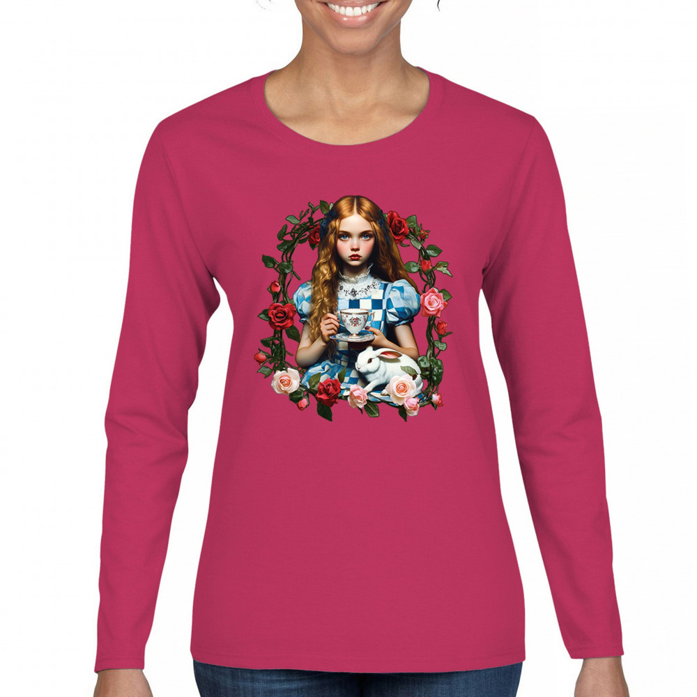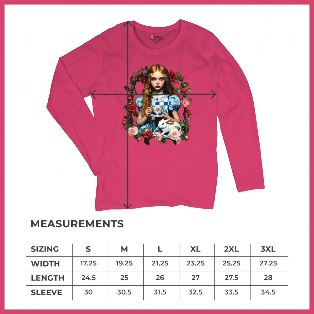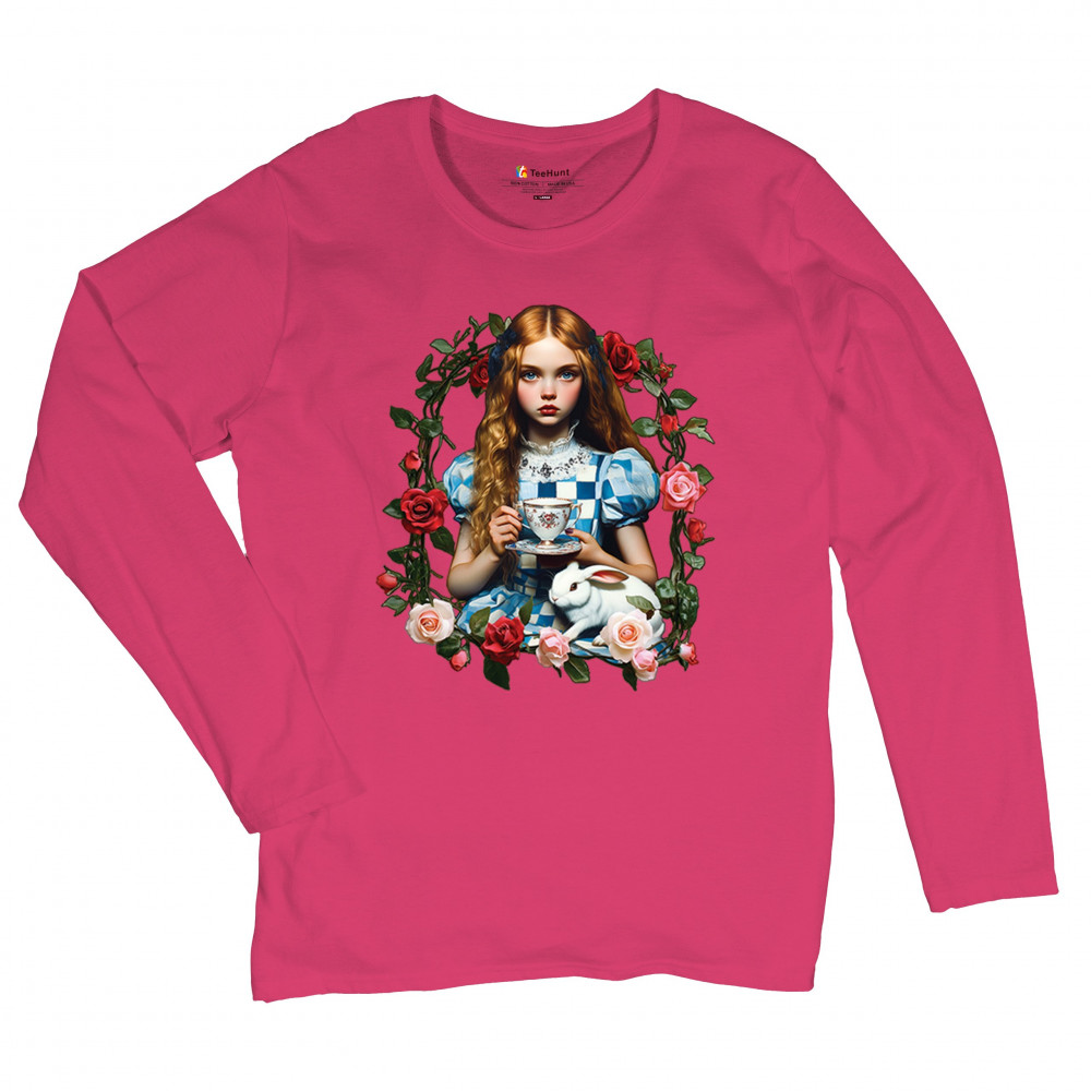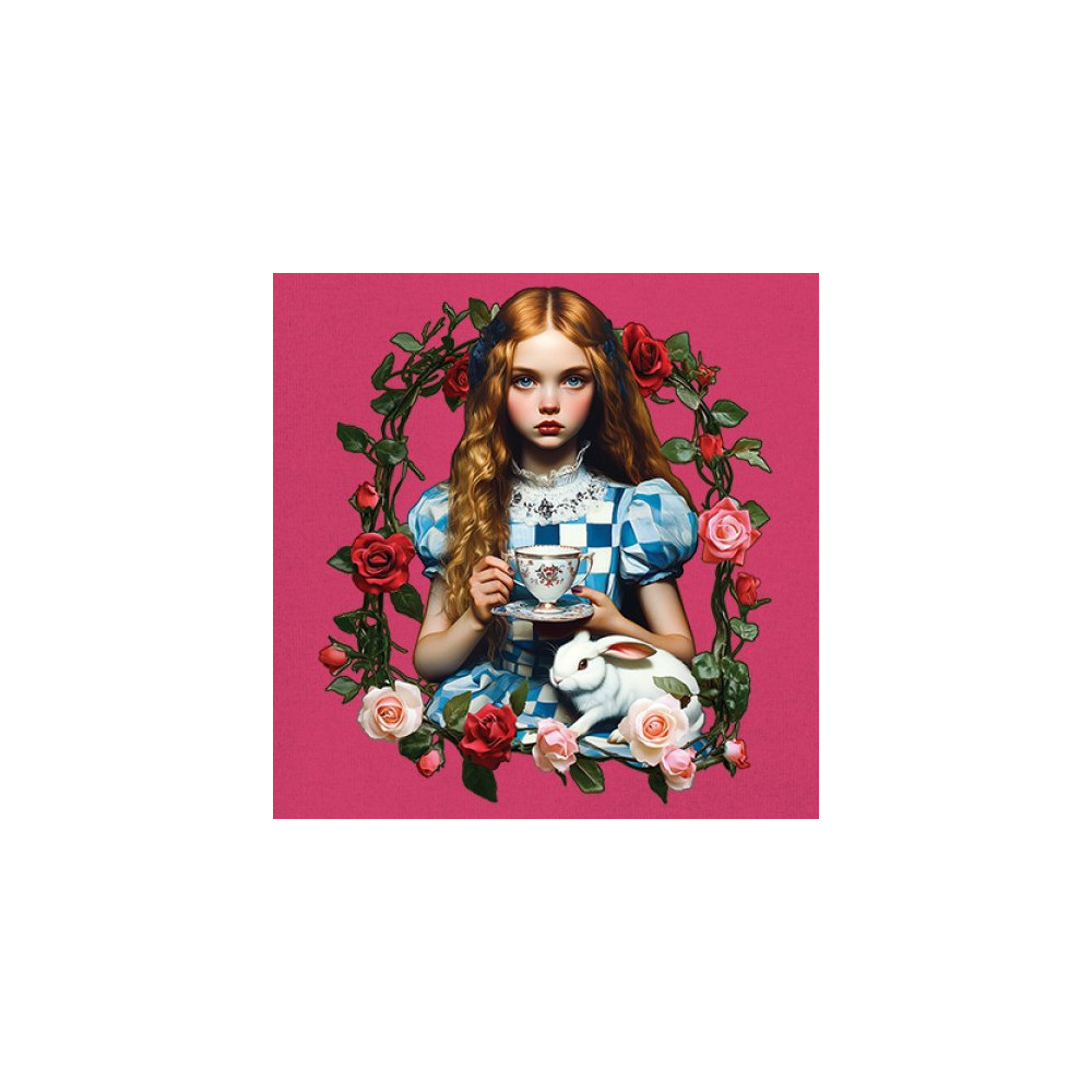 Step into a storybook dream with this Wonderland-inspired design featuring a young girl at a tea party with her white rabbit companion. Framed by roses, it evokes vintage charm, fantasy, and magical nostalgia. Ideal for bookworms, collectors, and lovers of fairytales, it blends whimsical elegance with timeless childhood wonder.
