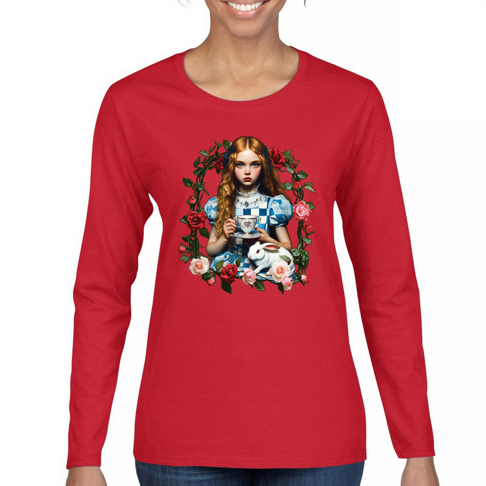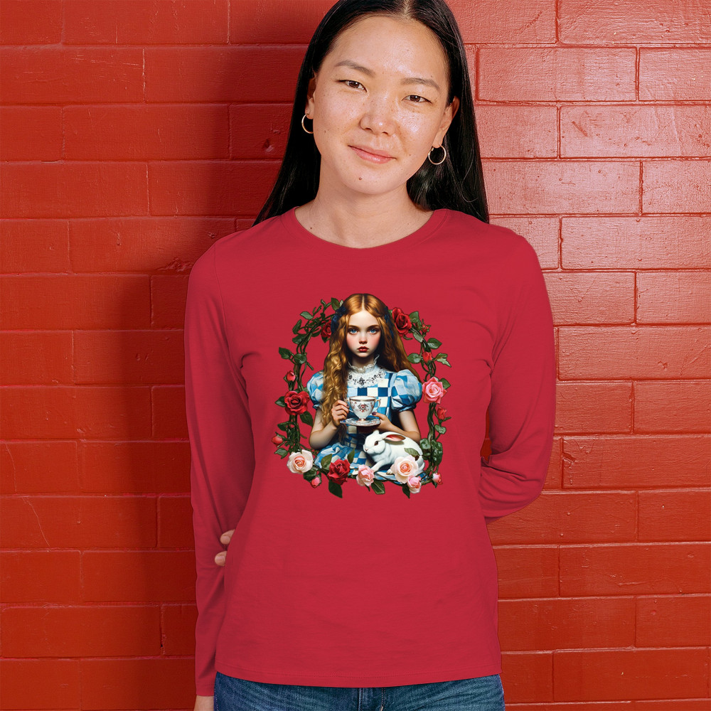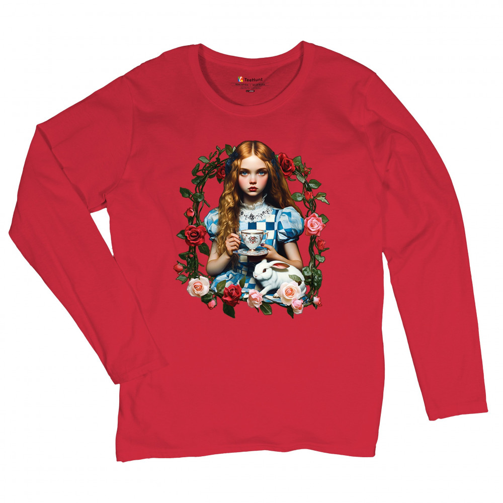 Step into a storybook dream with this Wonderland-inspired design featuring a young girl at a tea party with her white rabbit companion. Framed by roses, it evokes vintage charm, fantasy, and magical nostalgia. Ideal for bookworms, collectors, and lovers of fairytales, it blends whimsical elegance with timeless childhood wonder.