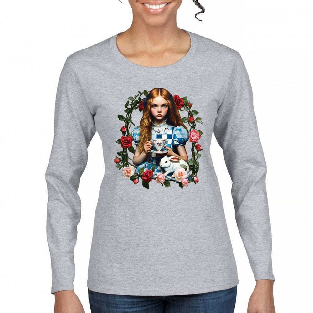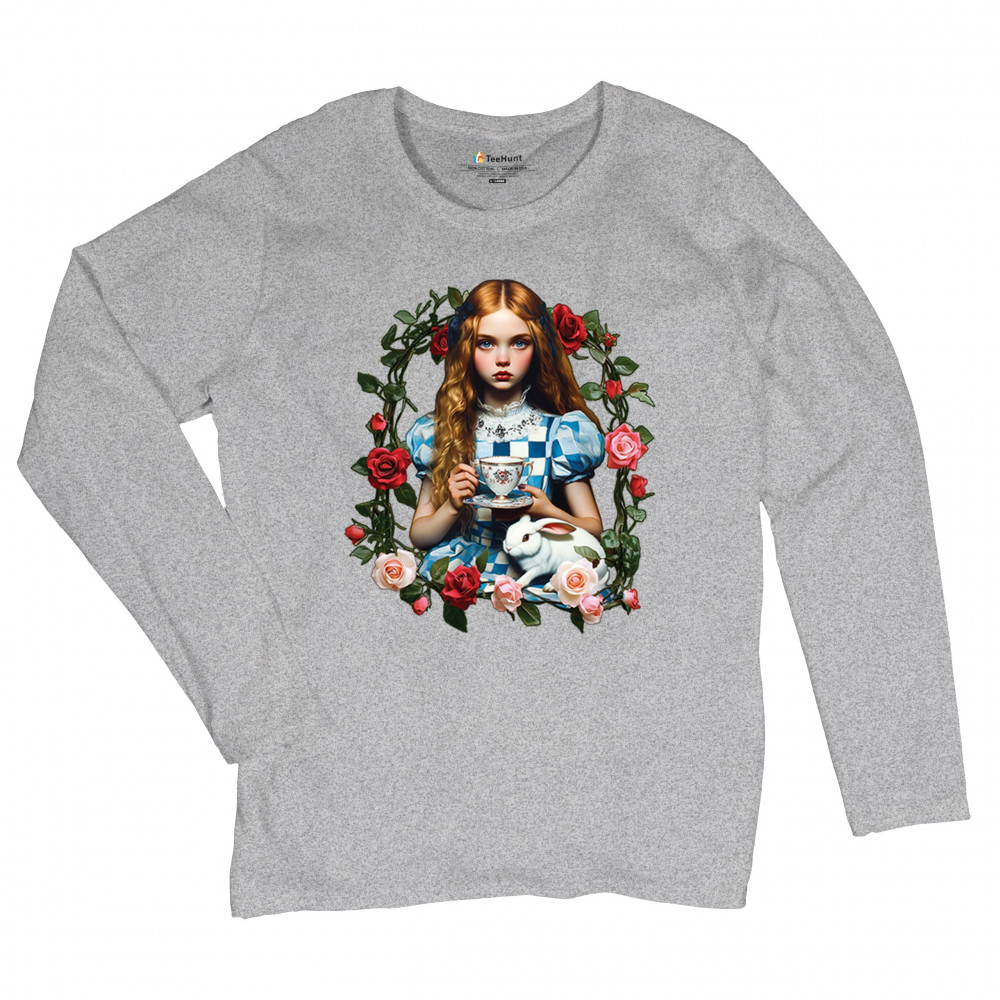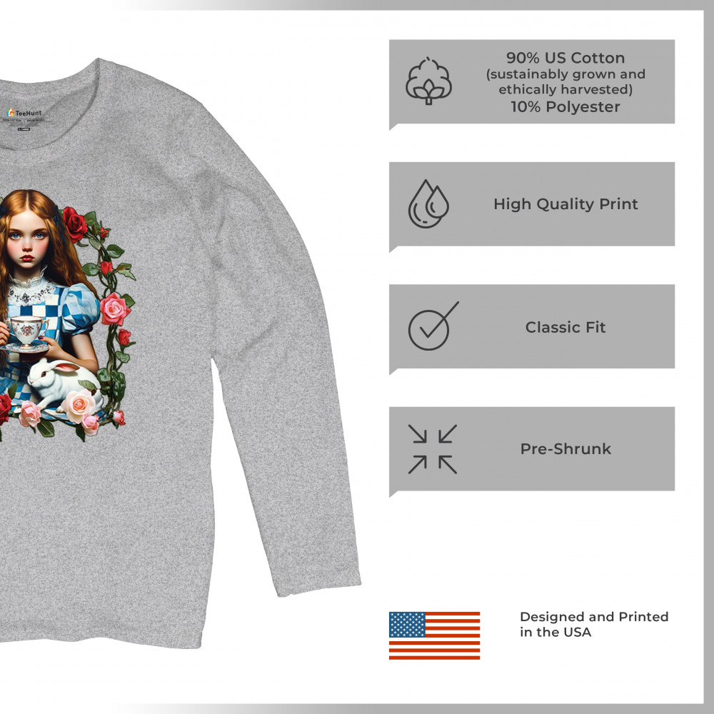 Step into a storybook dream with this Wonderland-inspired design featuring a young girl at a tea party with her white rabbit companion. Framed by roses, it evokes vintage charm, fantasy, and magical nostalgia. Ideal for bookworms, collectors, and lovers of fairytales, it blends whimsical elegance with timeless childhood wonder.