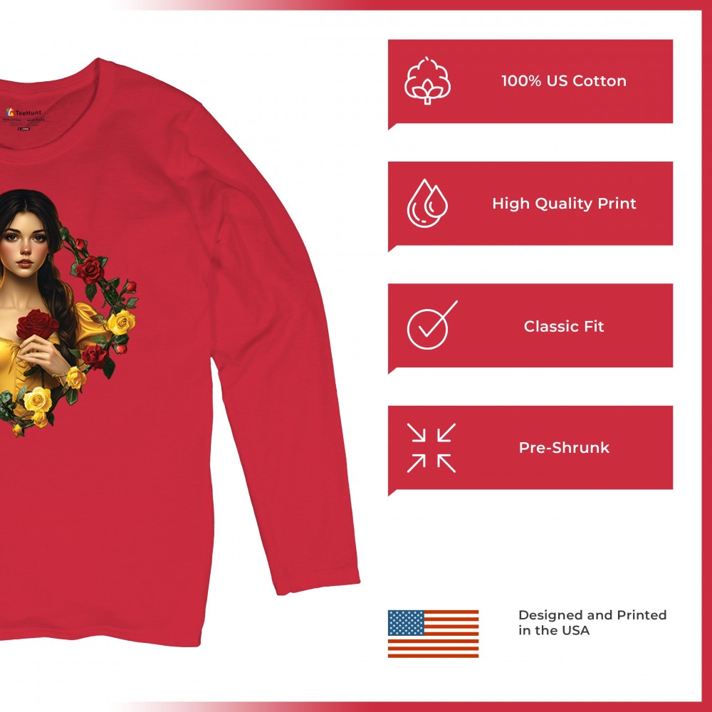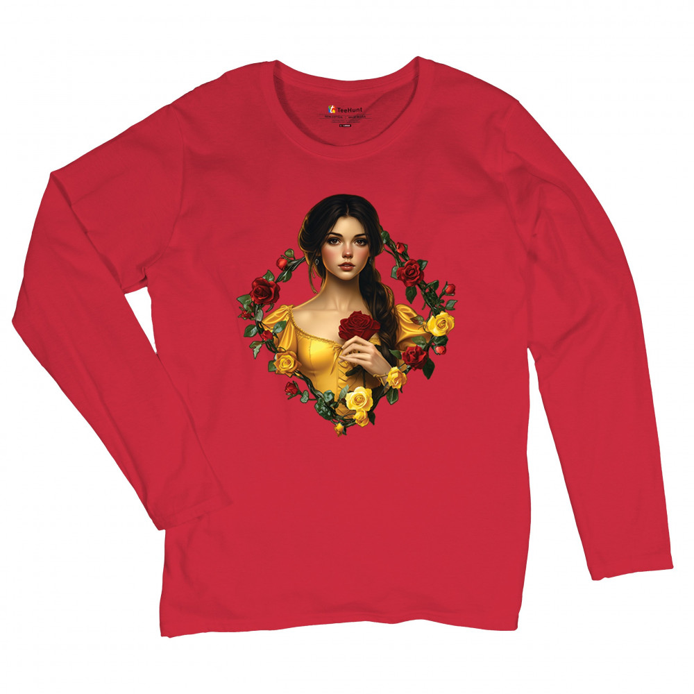 Inspired by classic fairytales, this design features a girl in a yellow gown holding a red rose, framed by rich red and yellow roses. A tribute to Beauty and the Beast, it radiates warmth, romance, and timeless fantasy. Perfect for storybook lovers, enchanted art collectors, or those drawn to magical, symbolic imagery filled with beauty and grace.