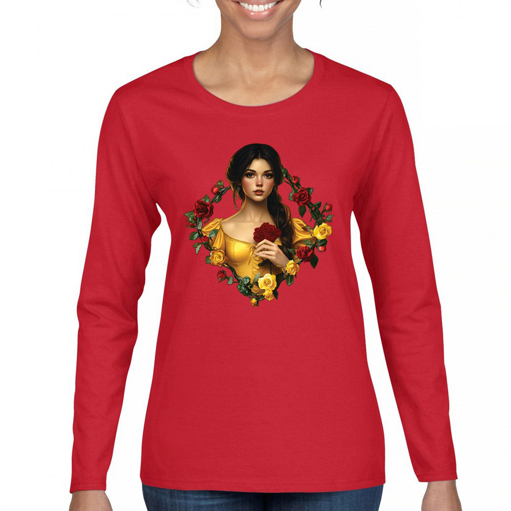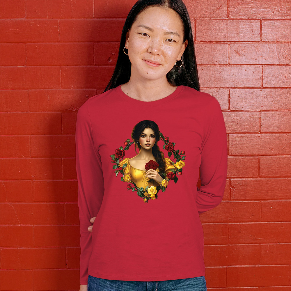 Romantic fantasy design of girl in yellow gown with red rose. Inspired by Beauty and the Beast, full of fairytale magic and classic charm.