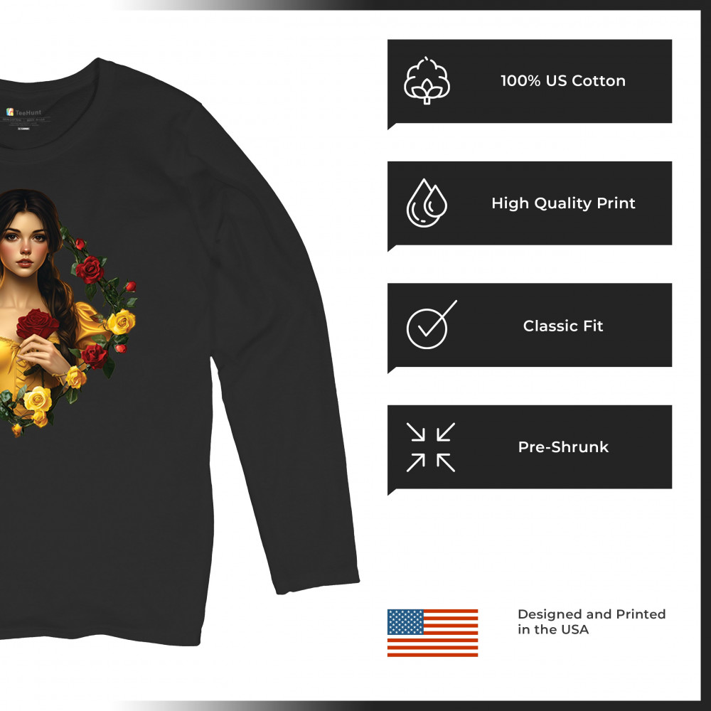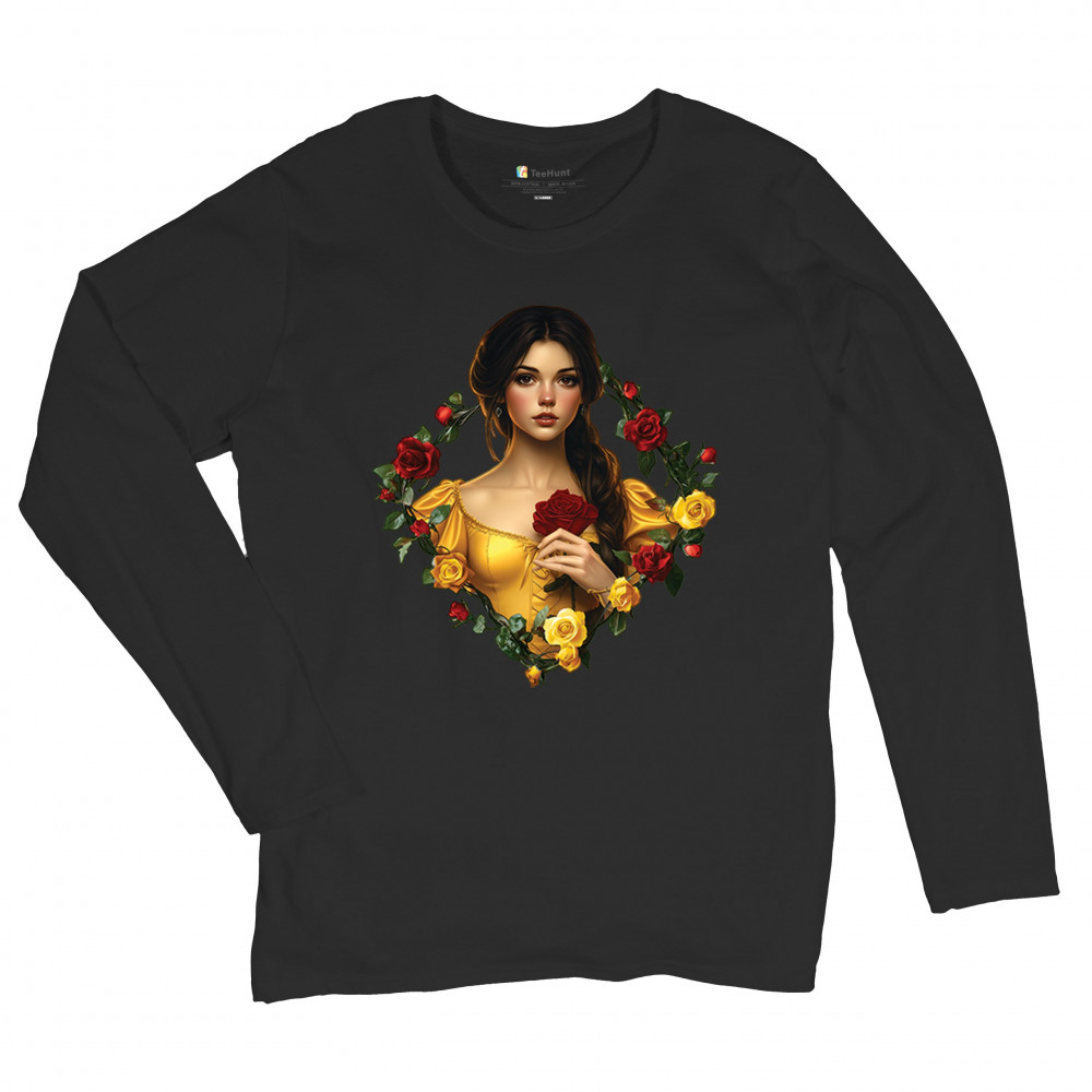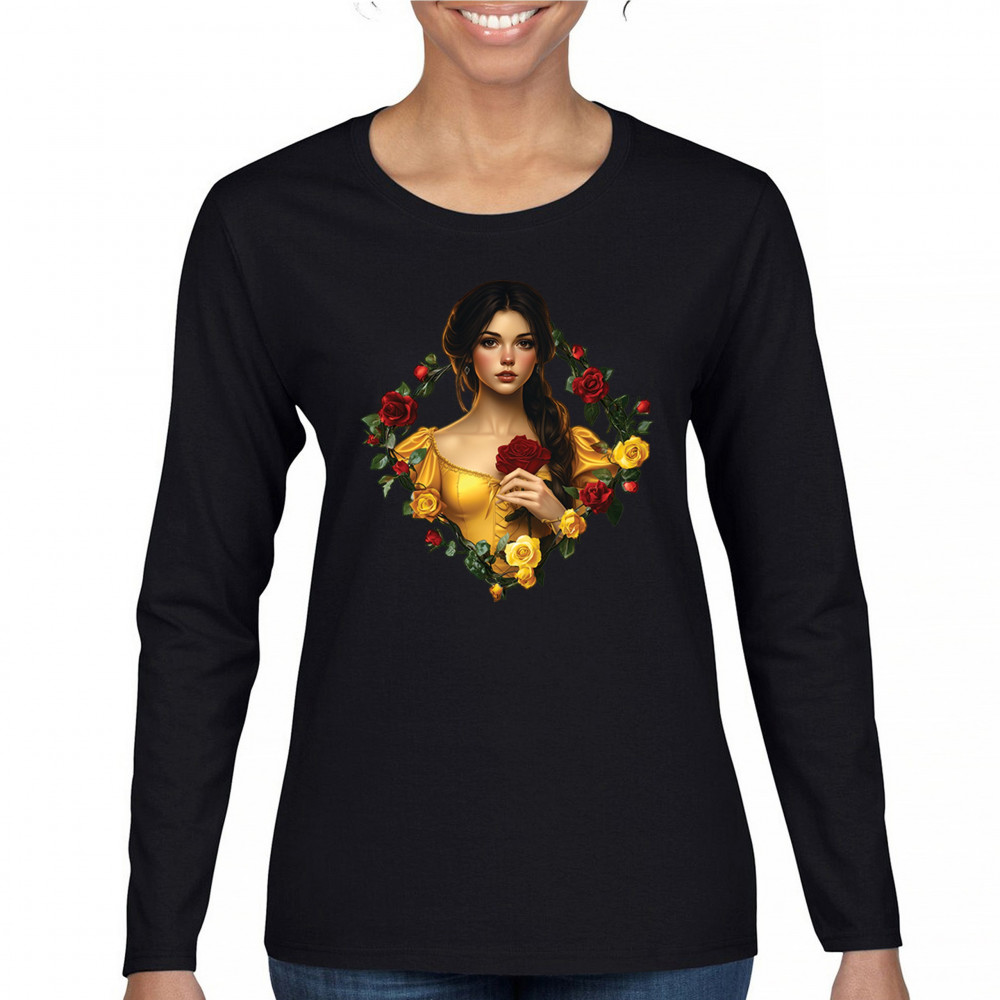 Inspired by classic fairytales, this design features a girl in a yellow gown holding a red rose, framed by rich red and yellow roses. A tribute to Beauty and the Beast, it radiates warmth, romance, and timeless fantasy. Perfect for storybook lovers, enchanted art collectors, or those drawn to magical, symbolic imagery filled with beauty and grace.